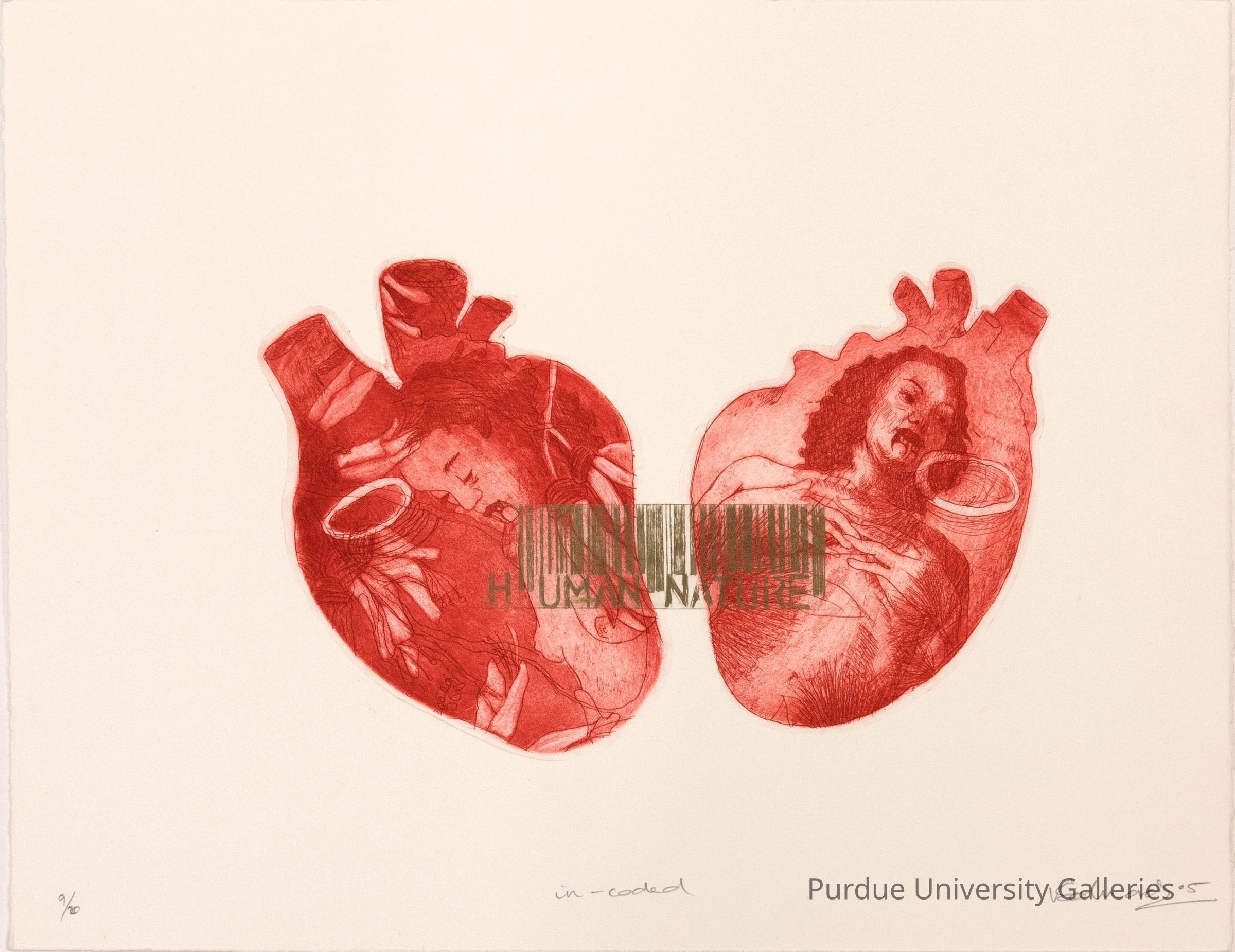 Intaglio print of two hearts in red on a heavy paper. Each hears has an image of a person - a woman. Over stamped on the hearts in gold is what looks like a bar code with the words "HUMAN NATURE" below it. Along the bottom edge of the paper in pencil "9/20" (bottom left corner); "in-coded" (center); "V. Edwards 05" (bottom right corner)Acquisition