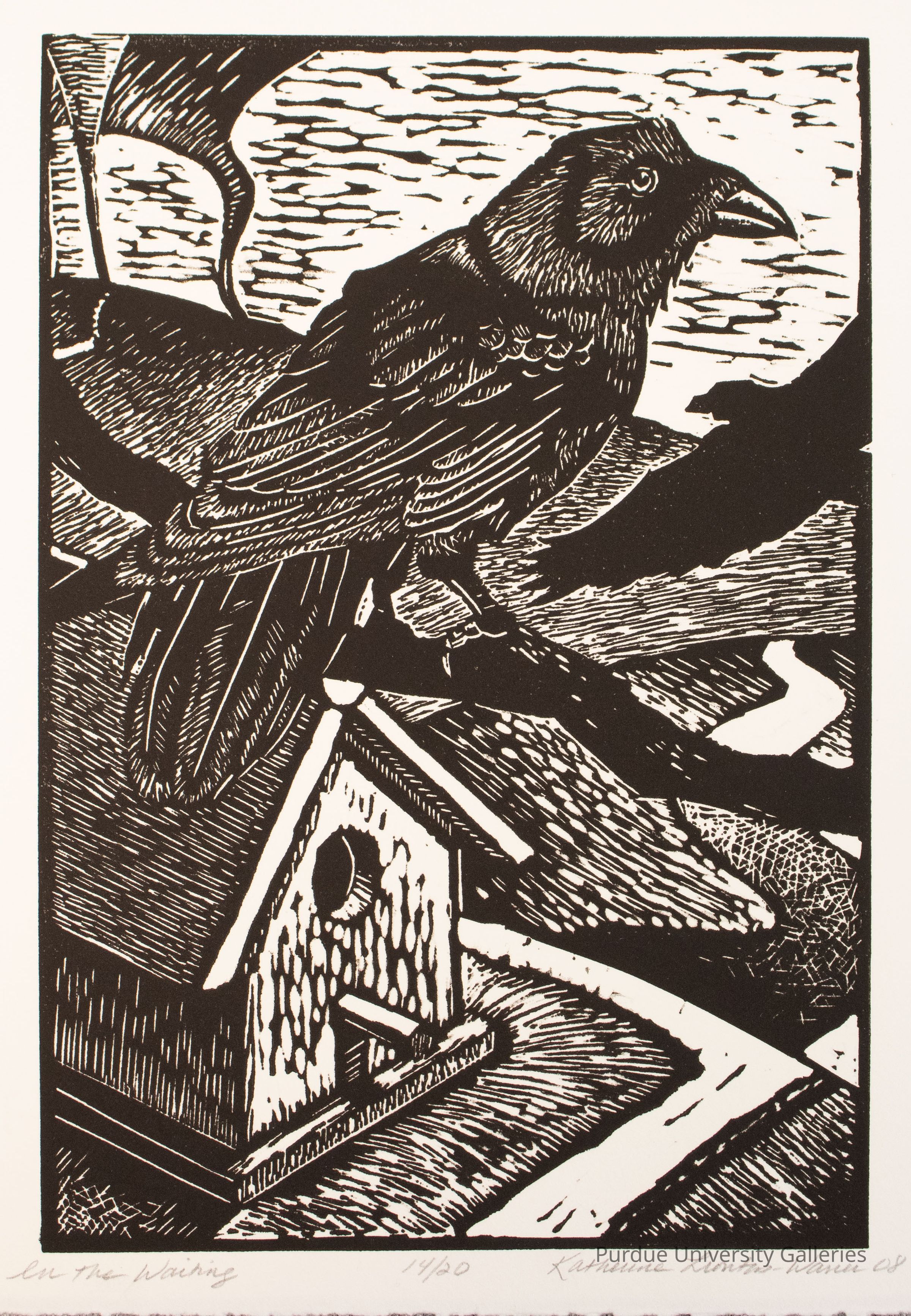 8" x 10" cardstock with print of raven sitting on a tree limb above a birdhouse. A path appears in the center right with shadow of a flying bird above it. Two tornadoes are in the top left background behind the bird sitting on the tree limb. The birdhouse is situated in a square set apart by a path/road. Along the edge of the paper written in pencil from left to right "In the Waiting," "14/20," "Katherine Liontas-Warren, '08"Type of Print