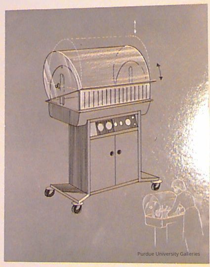 Grayscale, matted photograph of the prototype drawing of a incubator