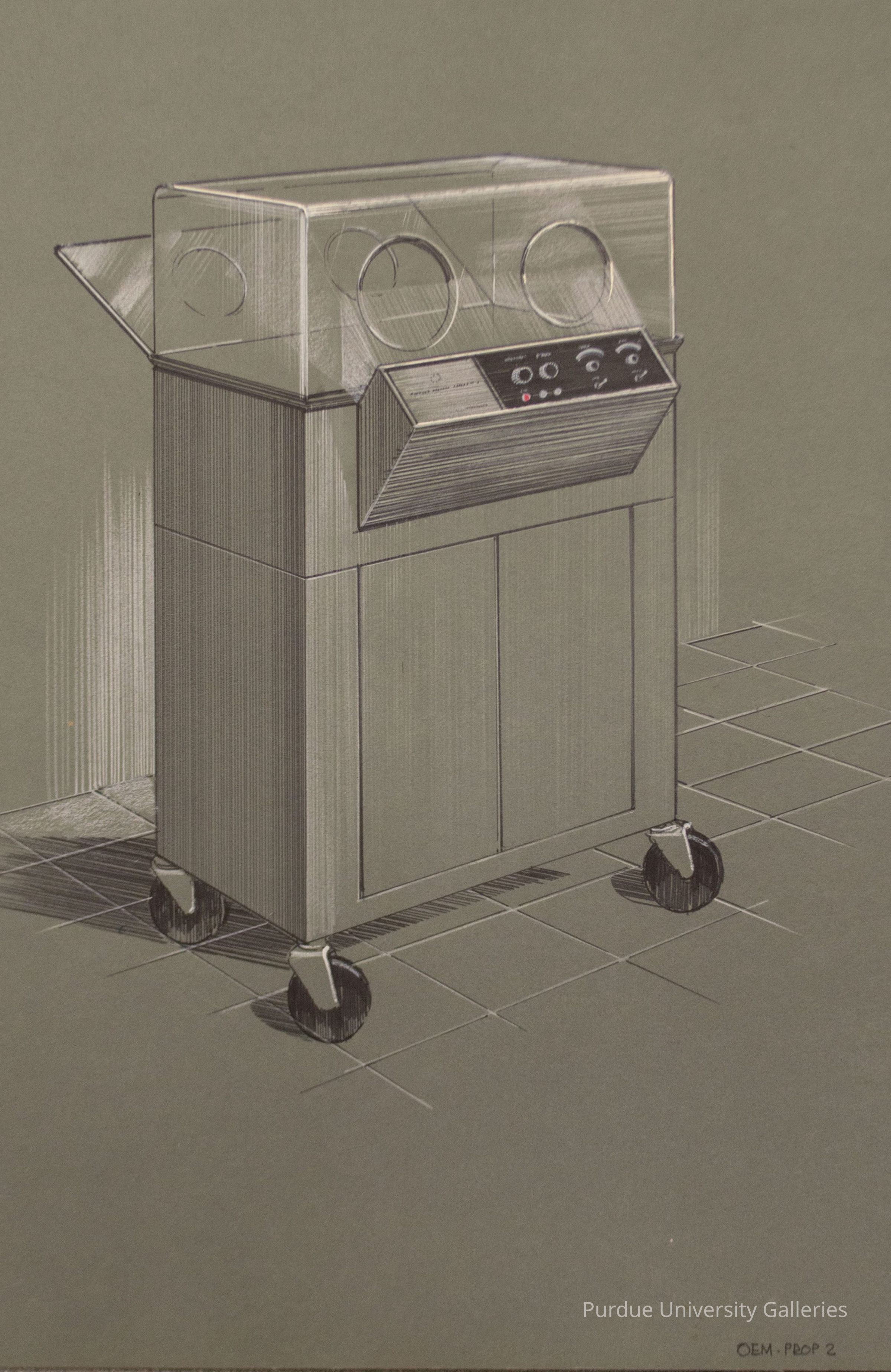 Drawing of a incubator prototype. "OEM . PROP 2" " is written on the bottom right-hand corner of the front side. The other objects like it have a cardboard backing that is glued on--which this object is missing.