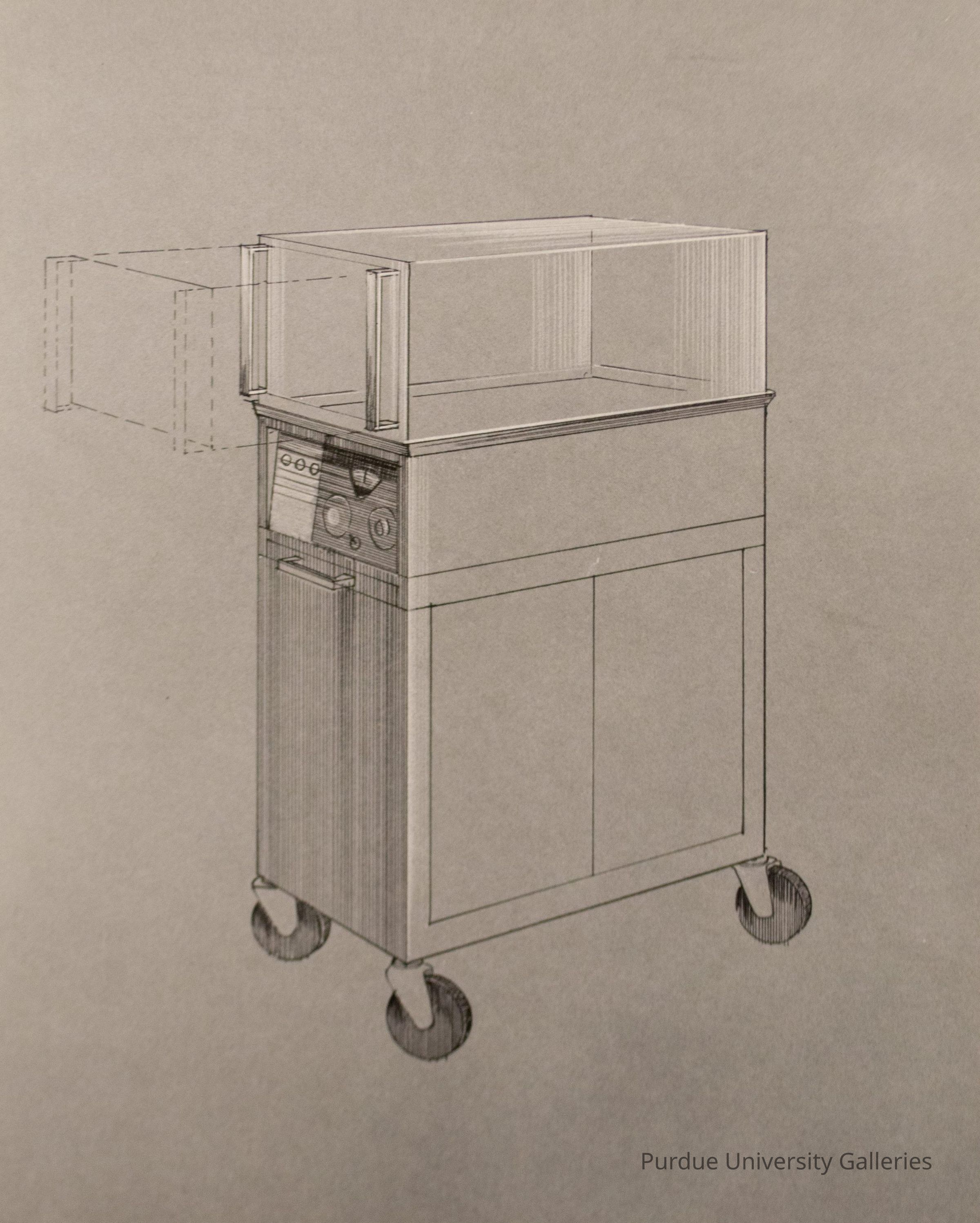 Matted, grayscale photograph of a drawing of a incubator prototype. "SMITH #4" is written in pencil on the back side just above the accession number.