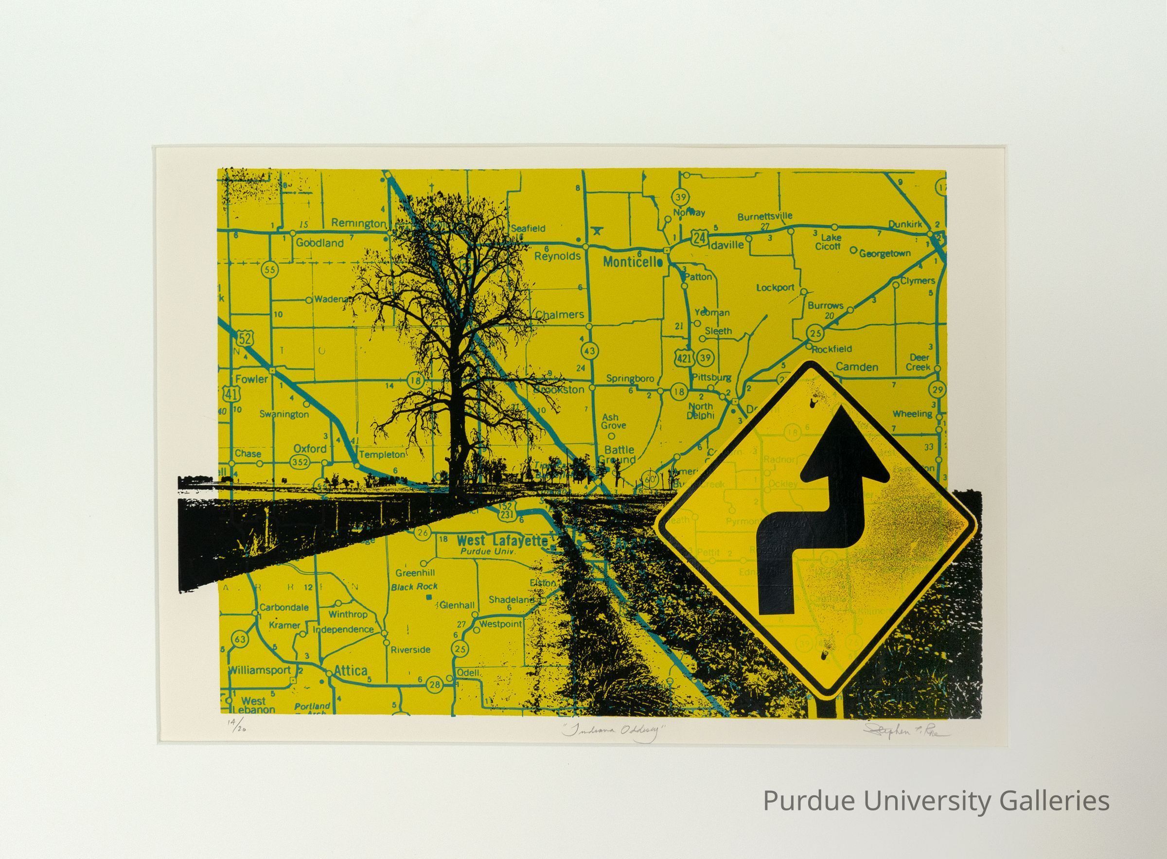 This is a screenprint of a map of Indiana. It focuses on West Lafayette and some places around it such as Monticello. On top is a key of a road with a sign meaning sharp corners ahead. The background is in a solid yellow and the map itself is a solid blue. Black makes the key of the road, sign and trees.Type of Print