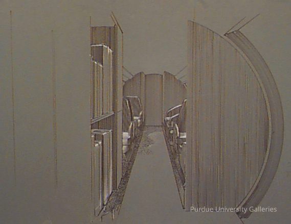 another monochrome design drawing for the interior of an airliner. picture of is a small walkway towards the first class portion of the airlinerType of Drawing