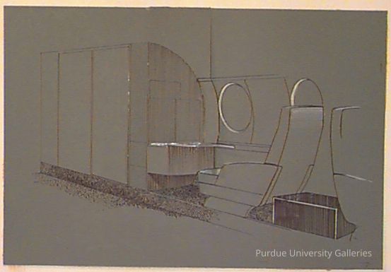 a monochrome design drawing of the inside of a plane. the drawing is for the very front seat in what looks to be a commercial airliner with a window to the side as well as a table for the front seatType of Drawing