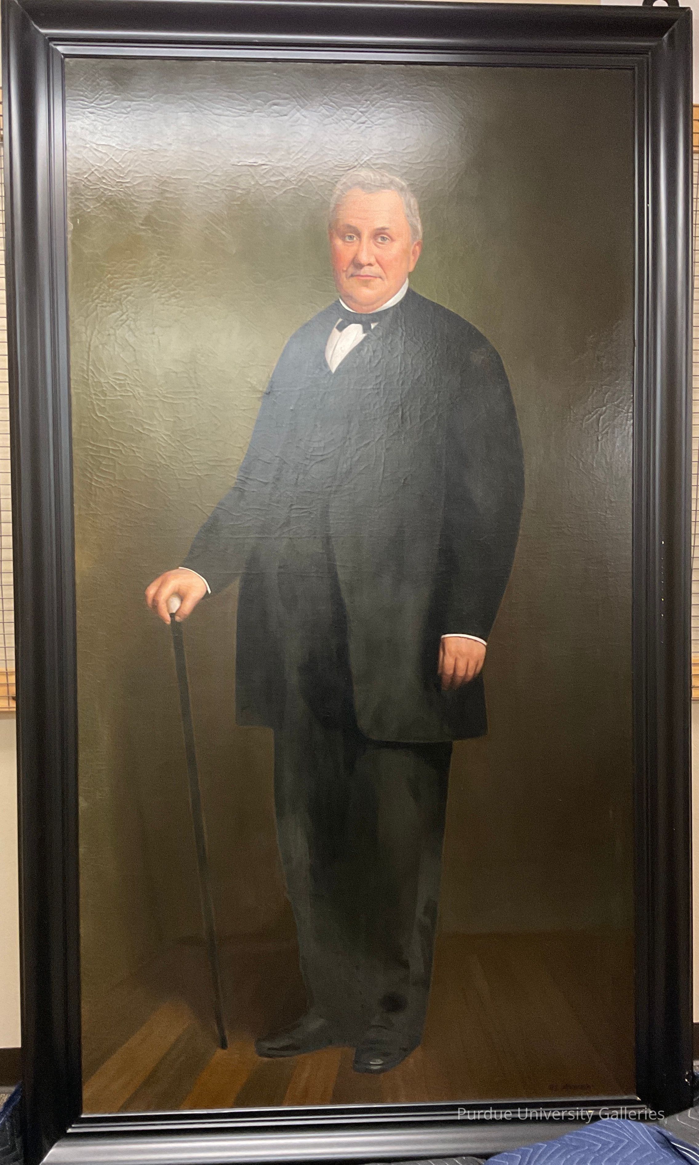 Full length portrait of John Purdue standing at a desk/chair wearing a dark suit c. 1870. Figure is a white, human male with graying hair and blue eyes. He is dressed in a black suit with waistcoat, topcoat and trousers over a white shirt w/ a black cravat. He is holding a cane that is black w/ a white handle. His hands have obvious blue veining. His face has a mole to the proper right of his nose, is clean-shaven but has some 5 o’clock shadow above his lip. Frame is black and appears to be original to the work. Painting appears to have been conserved at some point in the past.Type of Painting