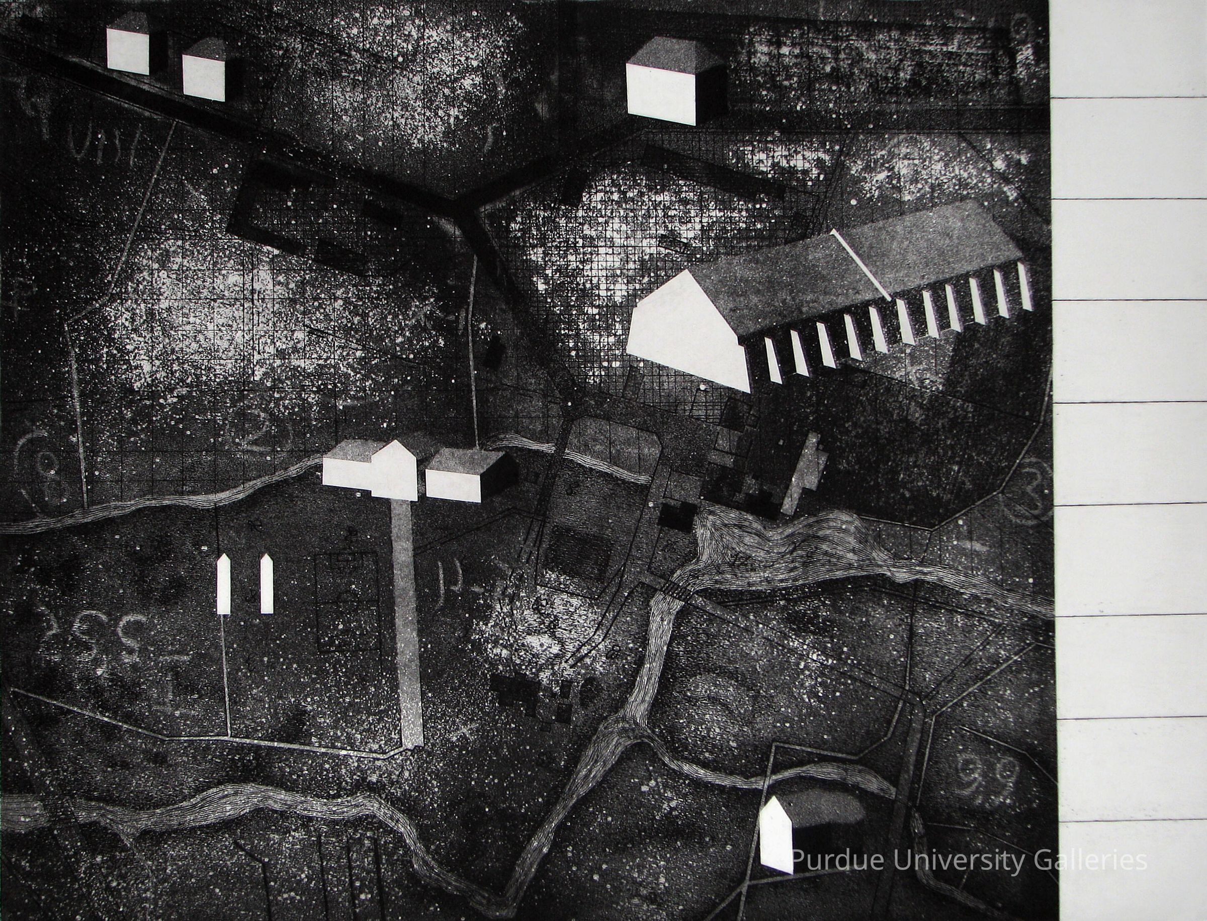 Journey X is typical of Winczek’s oeuvre, showing an aerial landscape populated with ghostly buildings, walls, foundations, roads, and pathways, crisscrossed with fractals and grids. Winzeck believes that the landscape, whether the physical landscape or the landscape preserved in memory, serves as a metaphor for human life, mapping the points in which choices or important memories were made.
