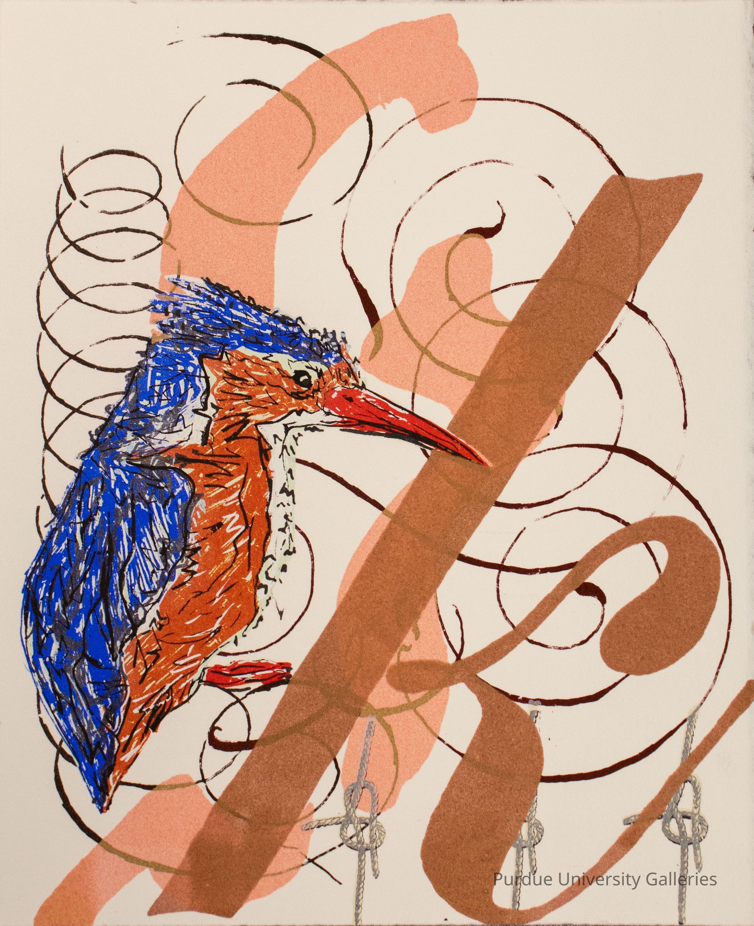8" x 10" cardstock with a kingfisher bird printed on the left hand side. Printed behind it are coppery and brown lines in a corkscrew pattern. In front of is the lower case 'k' with three rope knots behind it. On reverse side in top left hand corner is printed "K.A. Sheehan," "14/30," "2008," "k is for Kingfisher"