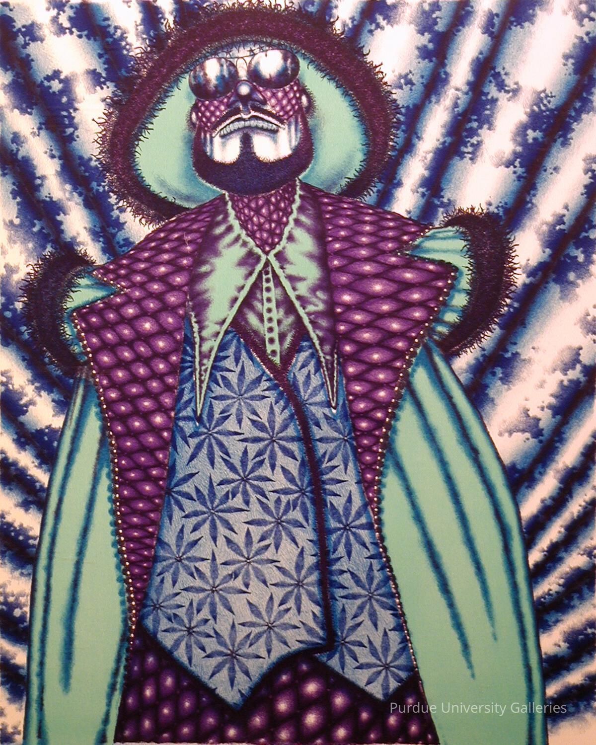 5-color lithograph. Shows a man with a fuzzy hat, glasses, and a dramatic coat. Displaying many colors and patterns, including; floral, fishnet, and cool colors.