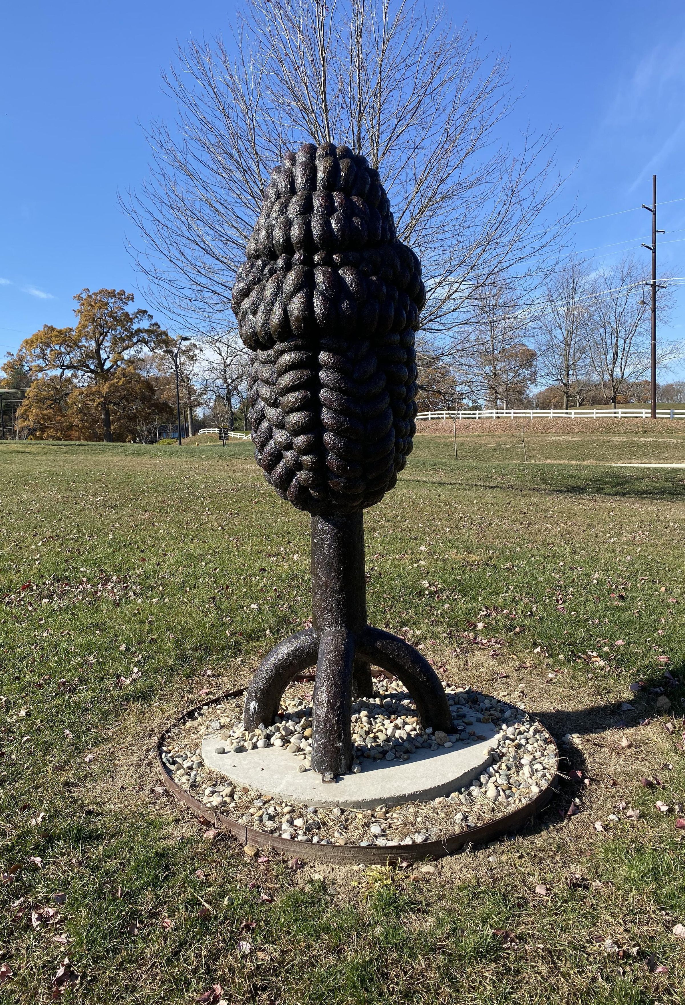 Molded plastic, ovular sculpture made up of what looks like interlocking braids stood on cylindrical pedestal with 4 legs bent out of it.Type of Sculpture
