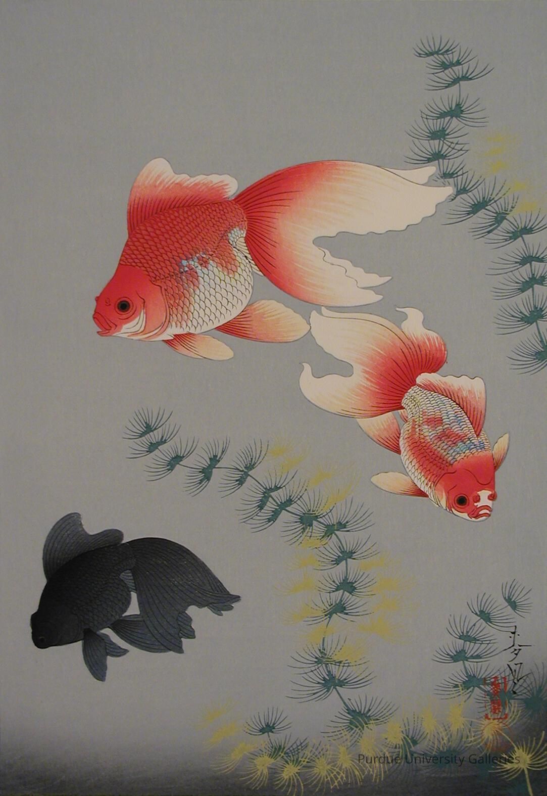 "In Japanese culture, the Koi represent long life and vigor. Koi are as long lived as humans and are very hardy. They have been kept as pets for more than 800 years. Bakusen Tsuchida was born into a wealthy and influential family in the Niigata Prefecture. Tsuchida found his own personal style based on traditional Japanese painting and printmaking. His subjects remained the Japanese tradition- women portraits, flower still lifes and genre scenes. "