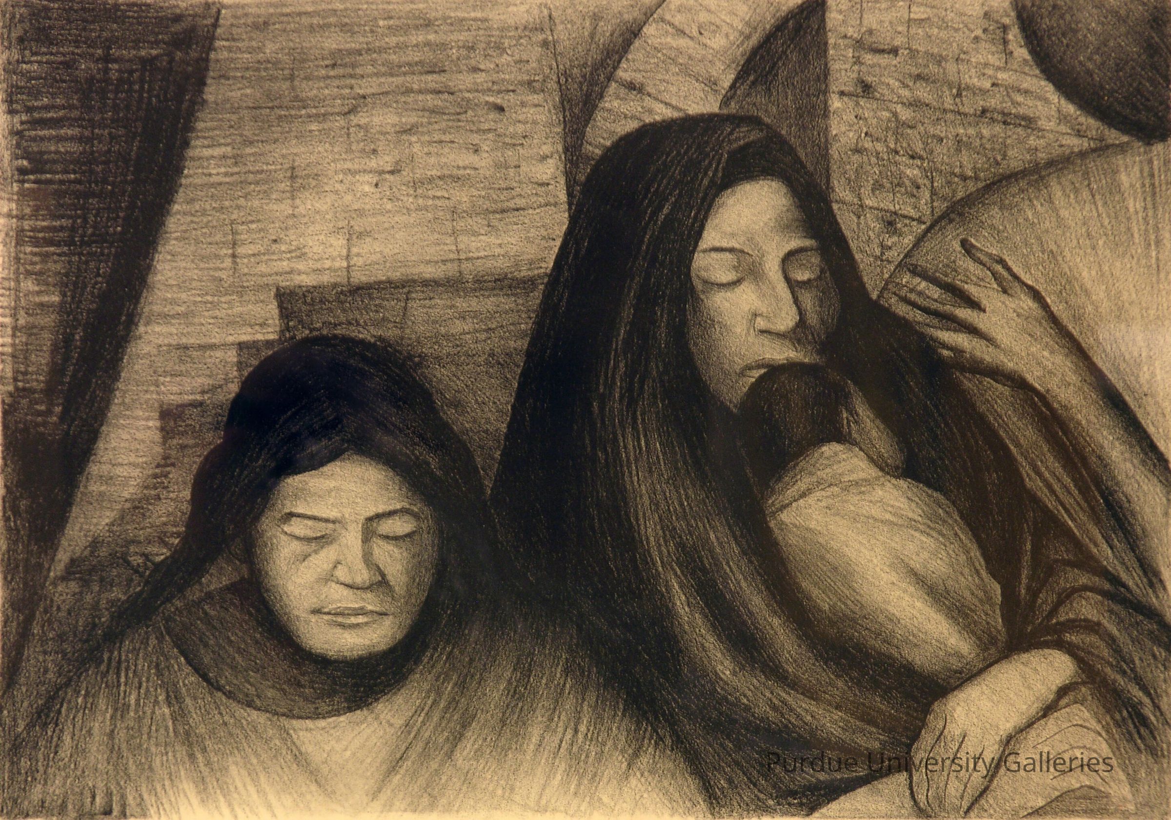 "In the lithograph, La Familia, José Clemente Orozco, the famous Mexican muralist, represented three generations of women during the Mexican Revolution (1910-1920). The women, dressed in traditional Mexican clothing, are sleeping outside against a stone building. On the left, a curtain gives the viewers the sense they are glimpsing the women through a window - a feature often found in his mural paintings. Although the women are asleep, their attitude conveys a deep sense of sorrow, but also of faith: faith in the family.
