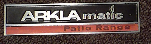 Black metal sign with a red bar on the bottom that says "Patio Range" in black letters. The raised, silver-colored words say "ARKLAmatic". The back is flat and green in color.Collection