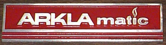 Red metal sign with raised, silver-colored words and lines "ARKLAmatic". The back is flat and green in color.Collection