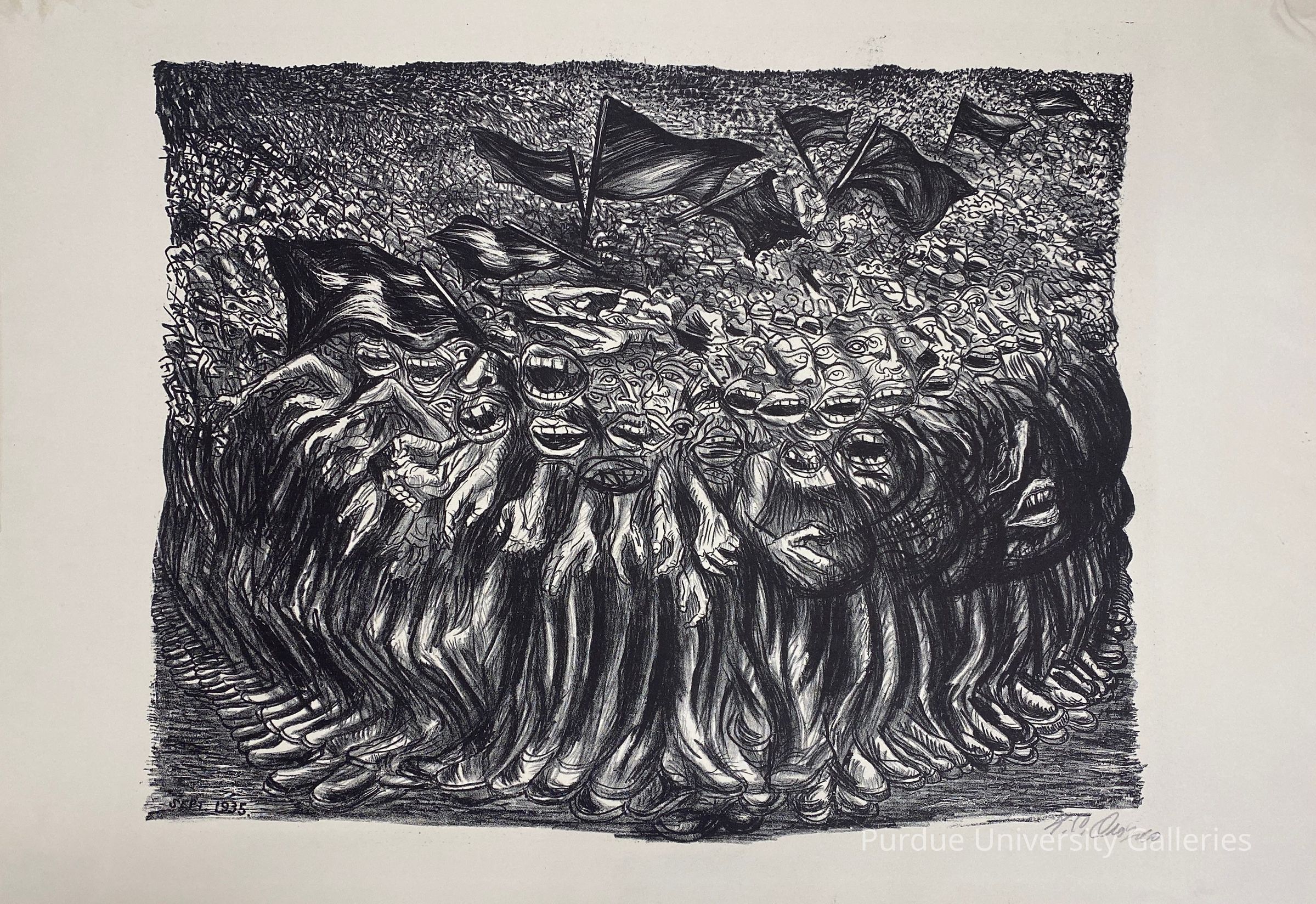 This lithograph is entirely in black, white and shades of gray, with a loose and not clean cut border. The print depicts a mass of figures with legs, hands, and faces (with eyes, noses, and mouths). Some of the figures towards the back of the group are waving flags. The further the group is from the front of the print, the less detailed their features become, eventually blurring into shapeless scribbles.Type of Print