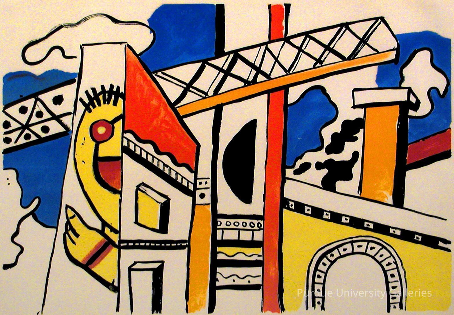 "Early in his career, Léger was associated with the Cubists, although his tubular and curvilinear abstractions contrasted with the rectilinear forms preferred by Cubism's founders Picasso and Braque. When Léger made his first prints in 1920 he had become associated with the Purist movement and his work exemplified the ""machine aesthetic"" which Purism stood for. His work is noted for its flat, unmodulated colors, heavy black contours and a continuing concern with the contrast between cylindrical and rectilinear forms.