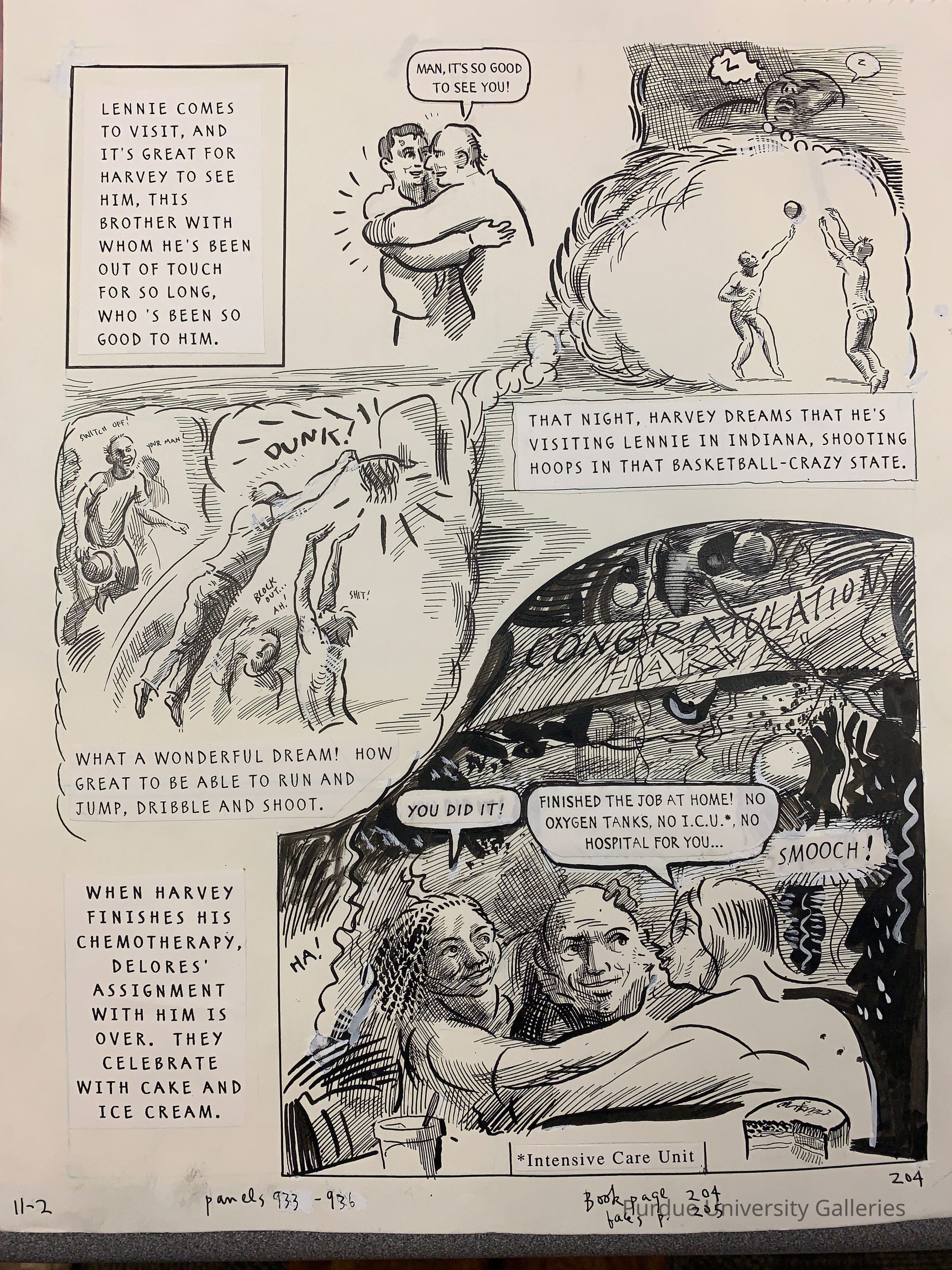 The piece is titled, "Our Cancer Year (Four Walls Eight Windows, 1994)" and it was written by Joyce Brabner and Harvey Pekar. This is a non-fiction comic that tells the story of Harvey overcoming cancer and his journey with his wife Joyce. Our Cancer Year was illustrated by Frank Stack (he also goes by Foolbert Sturgeon). Purdue owns 3 of the original sheets of this comic. In this piece it is the latest in date from the other 2 Purdue holds. This page describes Harvey's brother Lennie visiting Harvey himself. Harvey is delighted to be united with his brother again. Later in the evening he imagined a life playing basketball with his brother and others. Harvey finally finishes his chemotherapy and they all celebrate.Type of Print