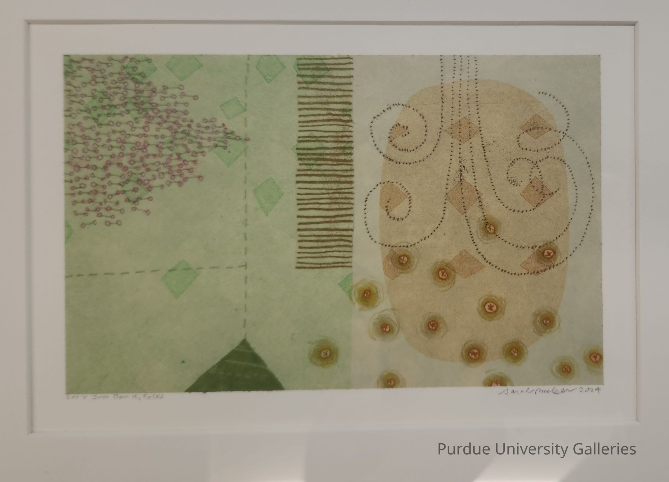 Print with two sides. Left half is green background divided into 3 parts. Top, left has circles and lines in the shape of an arrow. Bottom, left has a cone shape from which a broken line extend to the top of the print, and which verges left under the arrow. The space to the right of the broken line has 37 horizontal lines like a comb's teeth. Green diamond shapes are scattered in the top half of the green background. To the right side is a tan oval, with round 15 circular figures in the lower half. From the top of the print are curled lines which often are used to indicate a breeze or wind. Under the print in pencil from left corner to right corner "Let's Just Own It, Folks, Sarah Smelser, 2024."Type of Print