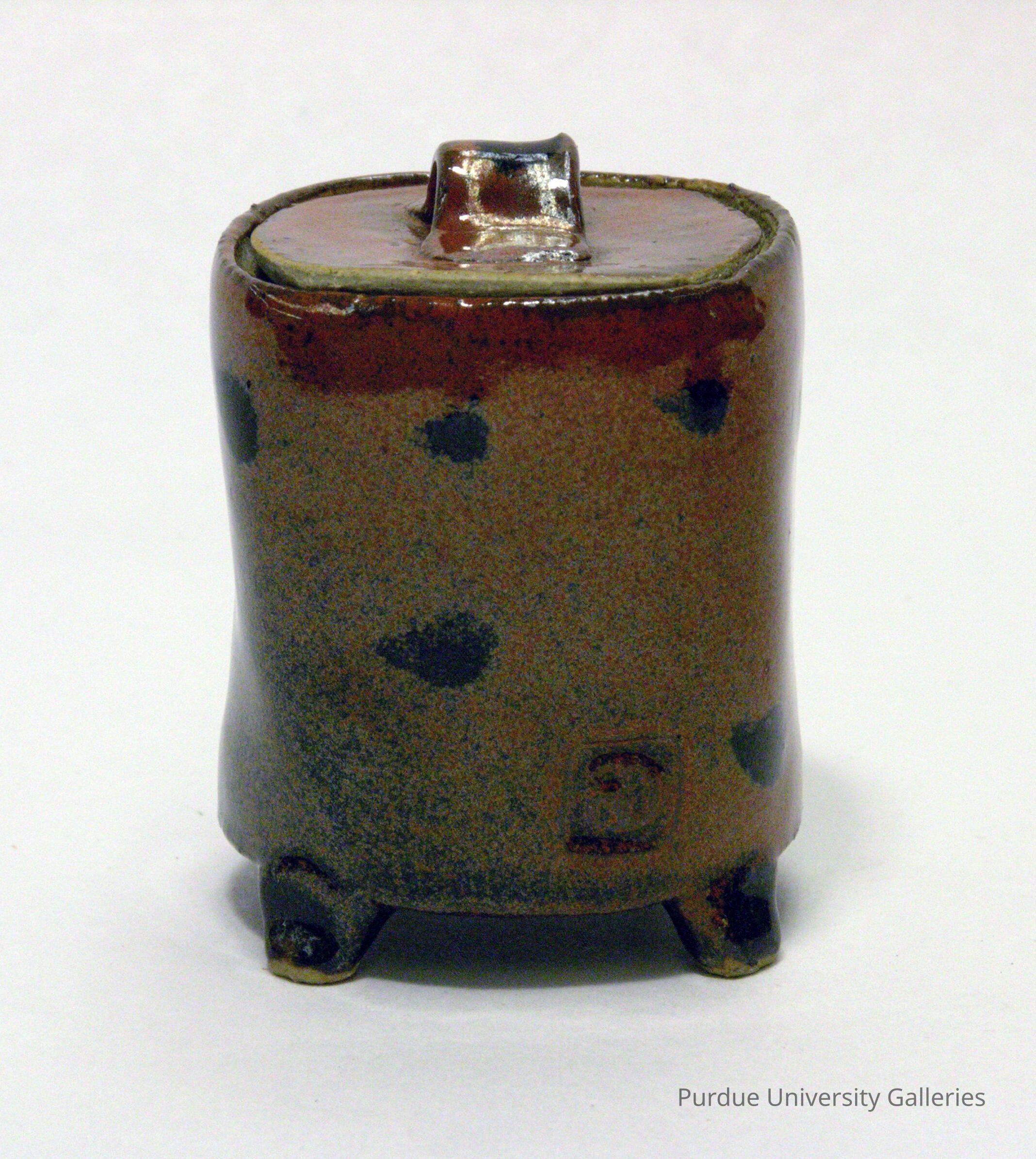 This lidded vessel has more of an organic shape to it rather than being completely perfect. The lips of the rim are thinner than the rest of the body. The lid is think and the handle looks hand built. The glazing on this piece is abstract and has a slight pattern to it with the glaze reacting to itself. The body of the box appears to be hand built as well or more loosely made on the wheel. There are dark blue splotches on the speckled box. There are tinges of dark red, brown, blue and green. There are tiny feet at the bottom of the vase that have little knobs on top of the curling feet.Type of Sculpture