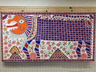 The painting depicts a stylized lion, characterized by a large orange head with exaggerated facial features and a long, squared body adorned with geometric patterns in red, blue, and white. The lion’s mane is represented by intricate lines radiating from the head, while the body is covered in a checkered pattern. The legs and surrounding areas are filled with floral and decorative motifs, with additional intricate designs filling the background.Type of Painting