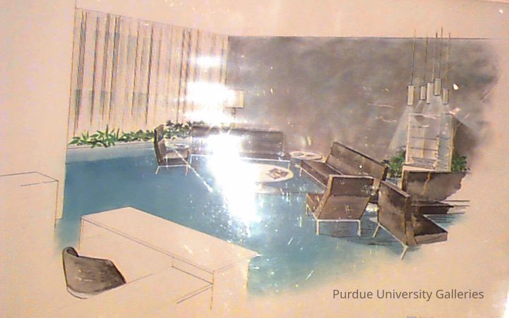 a design drawing for a lobby. with a sea blue carpet and various chairs all arranged in a sort of semi circle with a reception desk at the bottom left corner.Type of Drawing