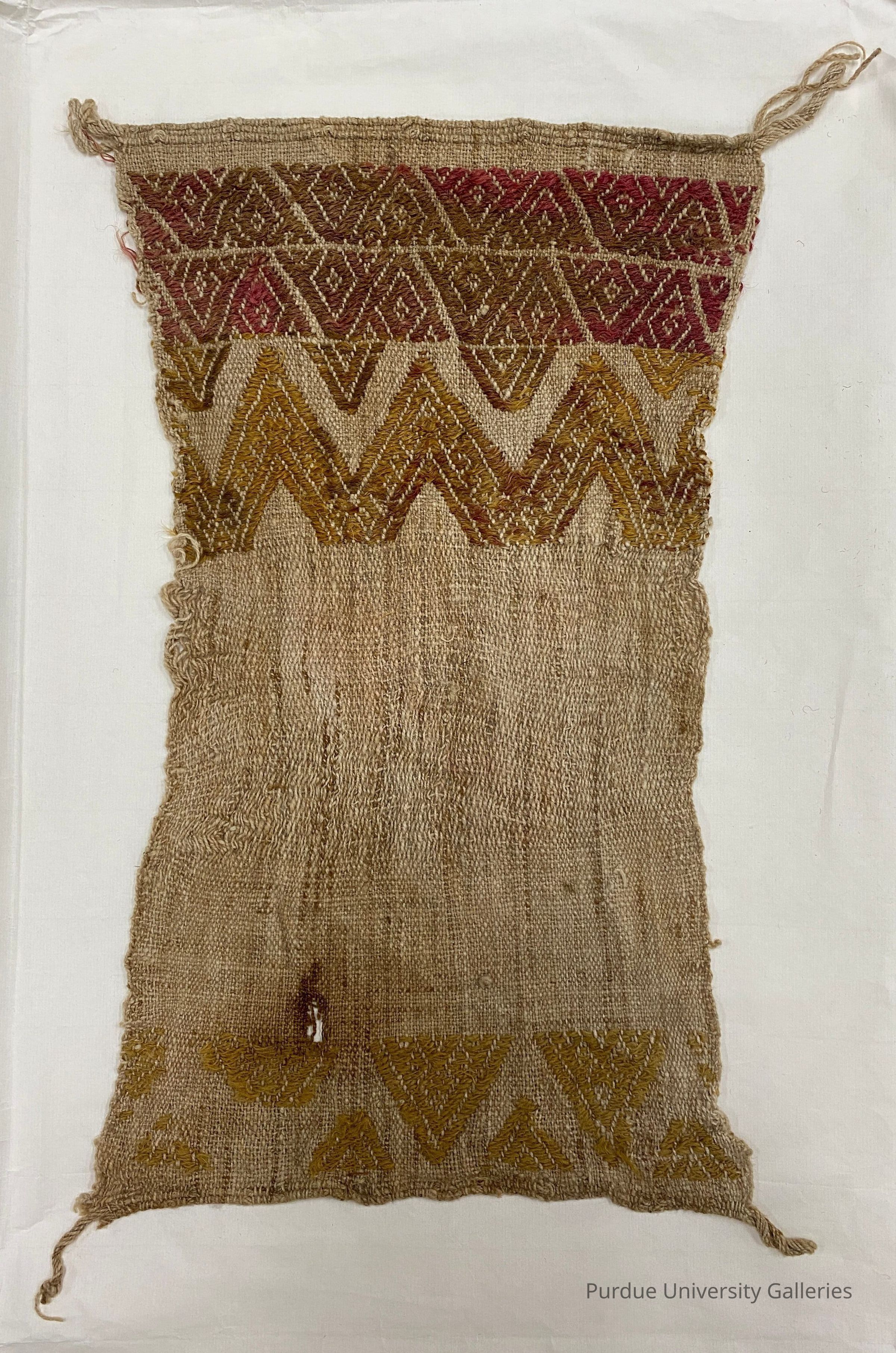 Miniature loincloth in plain weave cotton, with brocaded designs in red and yellow, on tan.Acquisition
