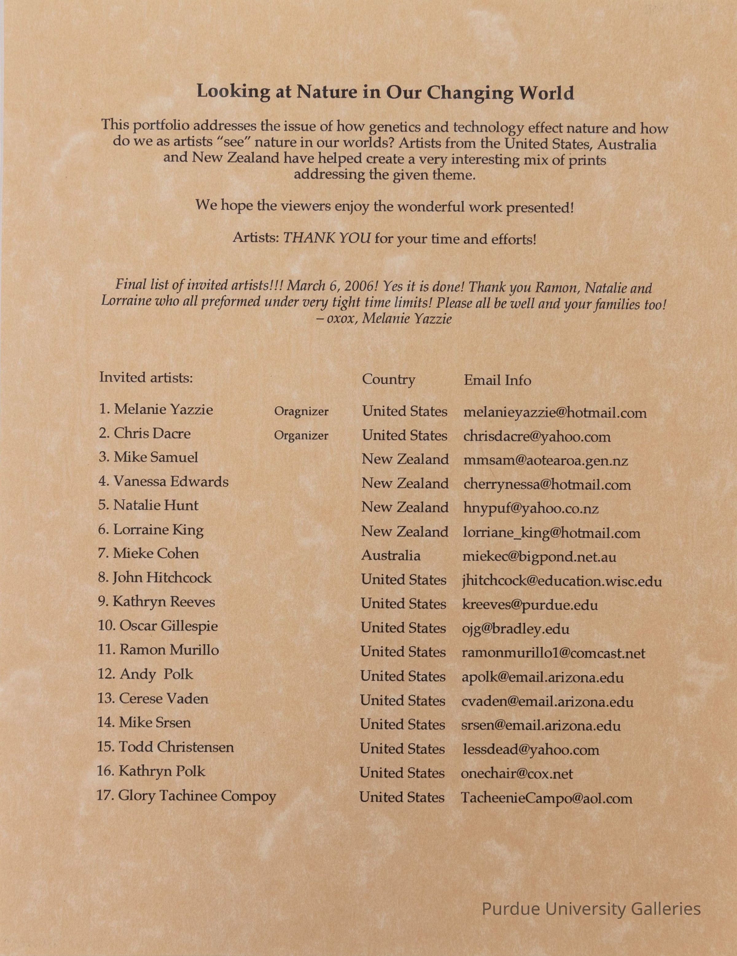 List of participants in portfolio including the names of organizers, ehtir country and email address. Black print on velum-style paper.Acquisition