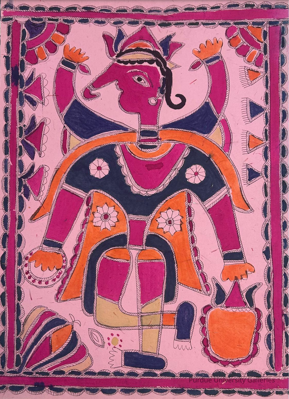 The central figure is adorned with intricate patterns and vibrant colors, depicted with a prominent trunk. The figure is wearing a crown and an attire that features bold colors, including pink, orange, and deep blue. The figure holds symbolic items in their hands.Type of Painting