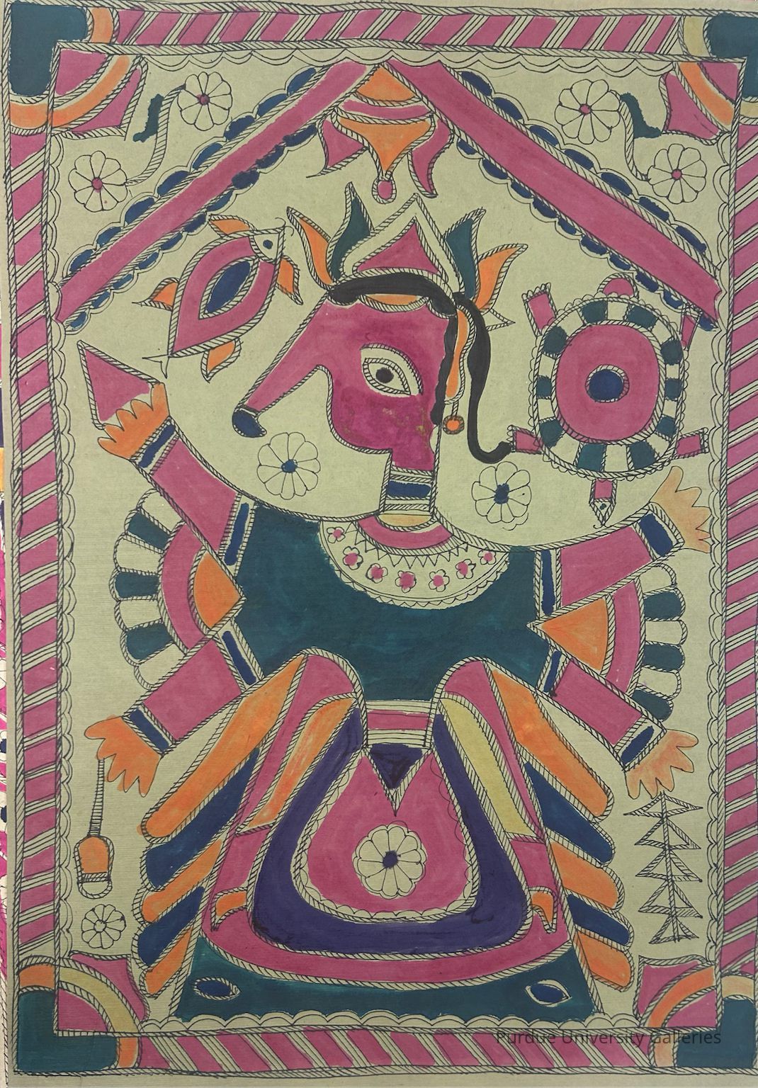 Traditionally produced by women, Madhubani/Mithila paintings are identifiable by bright colors, geometric patterning, and two-dimensionality.Inscription/Signature/Marks
