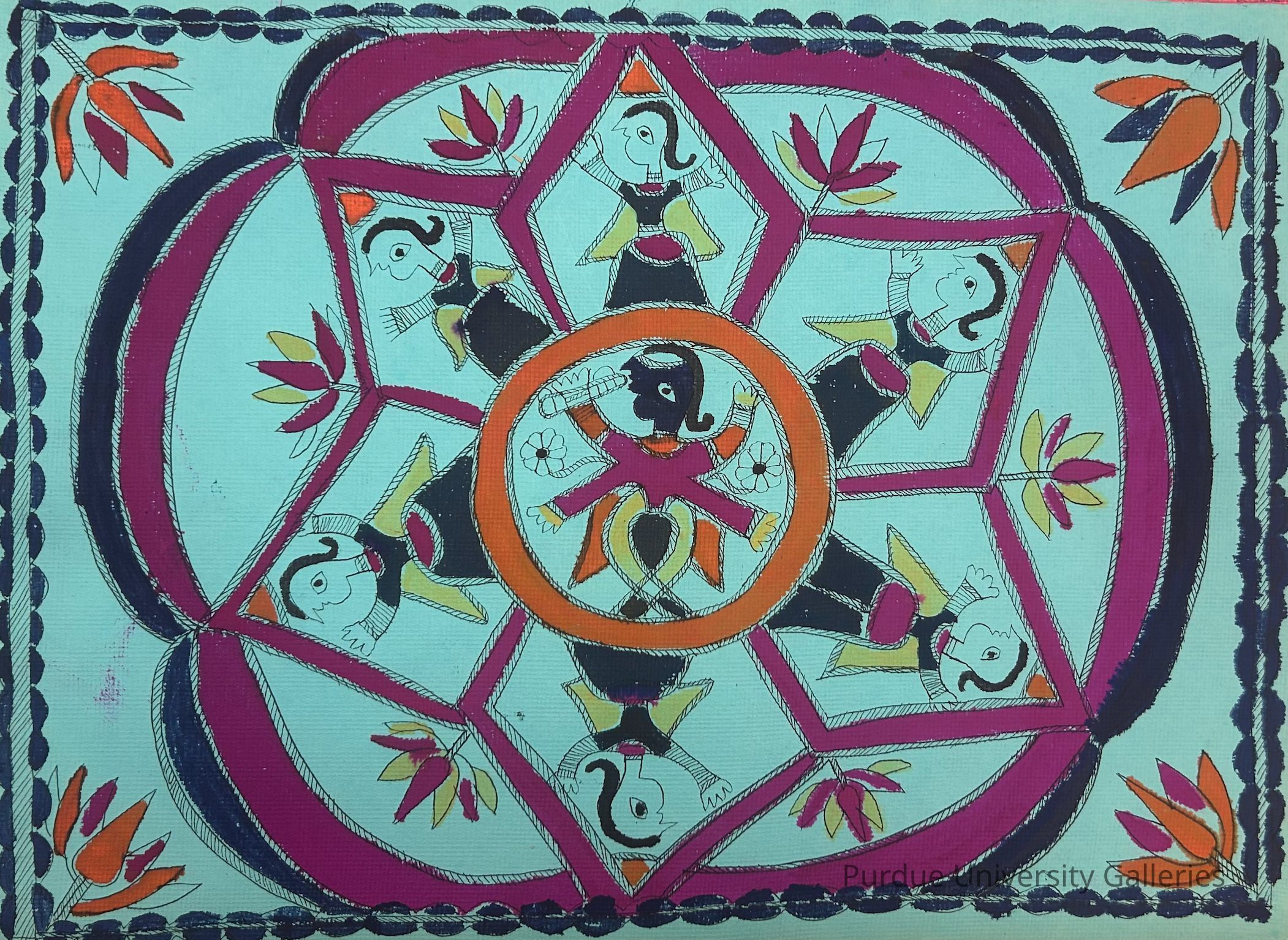 Traditionally produced by women, Madhubani/Mithila paintings are identifiable by bright colors, geometric patterning, and two-dimensionality.Inscription/Signature/Marks