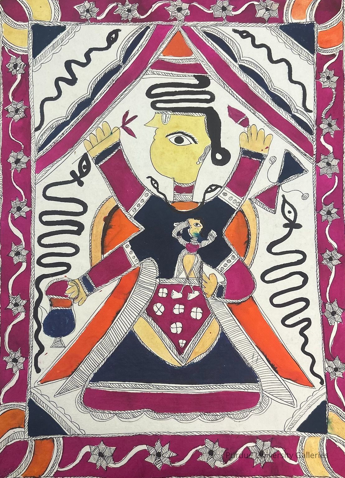 The painting features a central figure seated with multiple arms raised, holding symbolic objects. The figure is adorned with intricate clothing in shades of pink, orange, and dark blue. A serpent coils over the figure’s head, and additional serpents are drawn in the background. An additional figure is seen on the figure's chest.Type of Painting