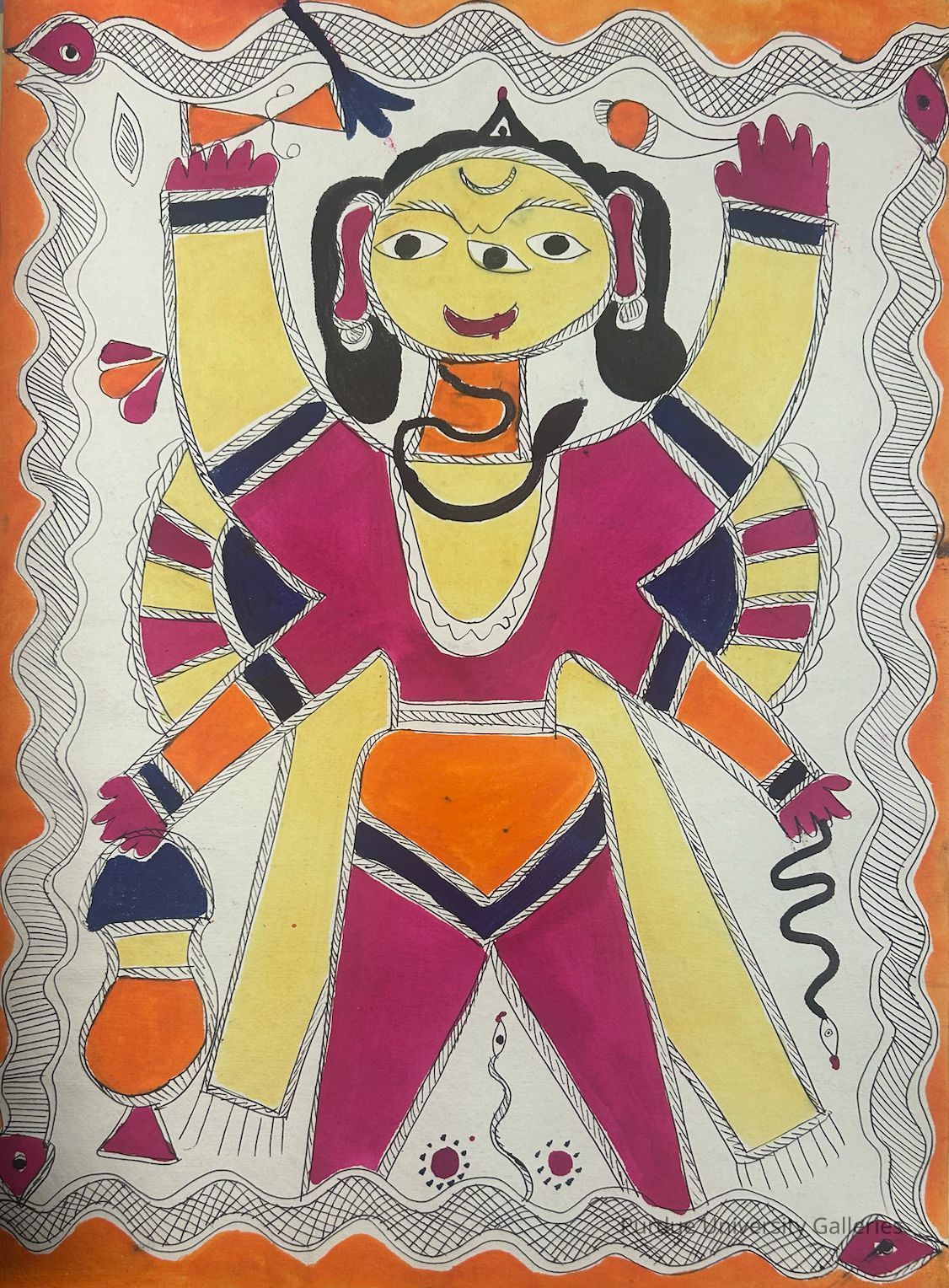 The painting depicts a figure with multiple arms, each raised and holding different objects. The figure is adorned in vibrant pink, orange, and yellow clothing, with distinctive facial features, including a crescent moon on the forehead. Serpentine shapes and other symbolic elements surround the figure, and the background is framed by decorative borders.Type of Painting