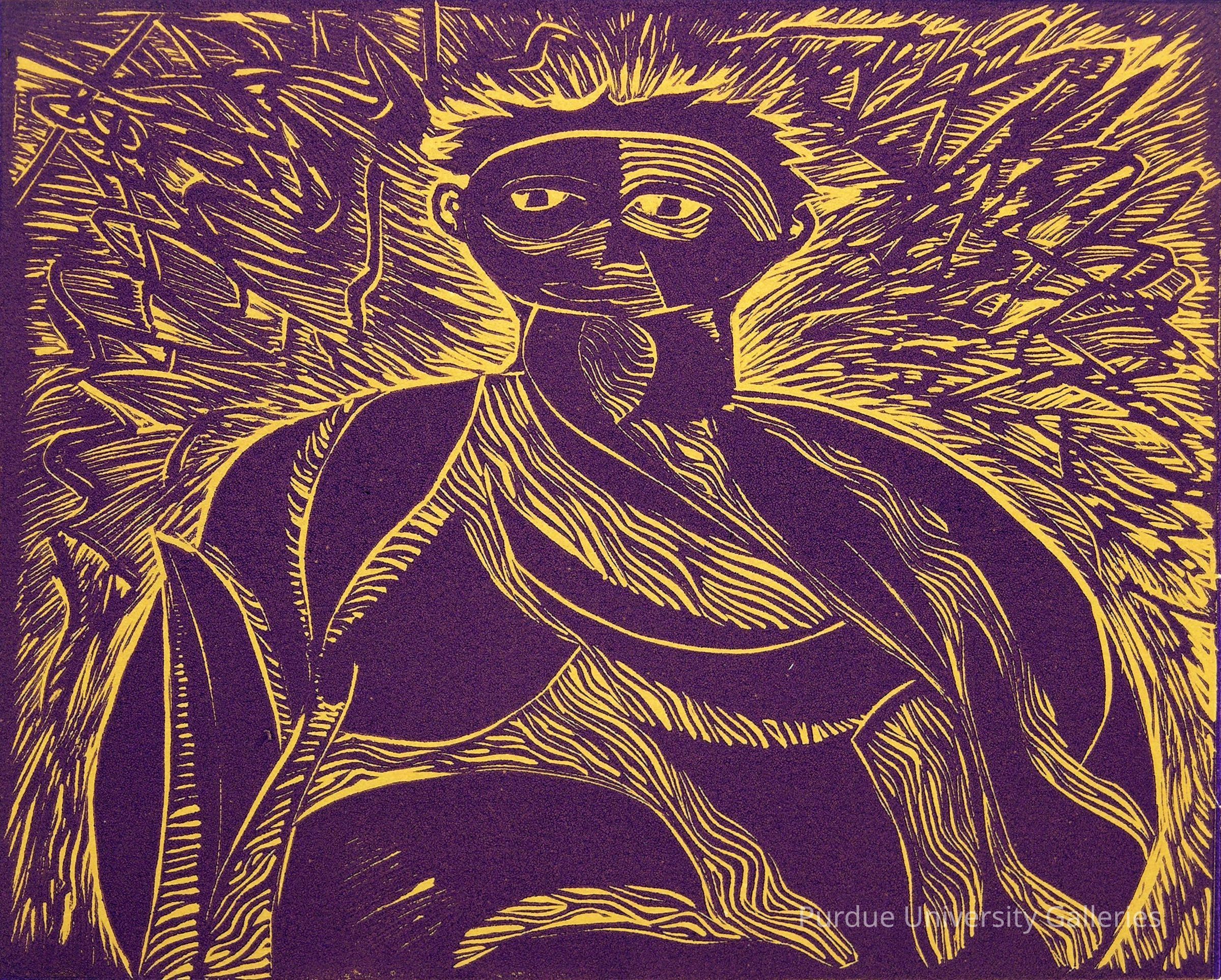 This linocut piece has two colors of purple and a yellow-ish color printed. It is a two-color linocut. This linocut is expressive and abstract in its ability to represent man as the title suggests. The face is representative of eyes and wrinkles, but the body is made from these slivers of positive space and arched texture.