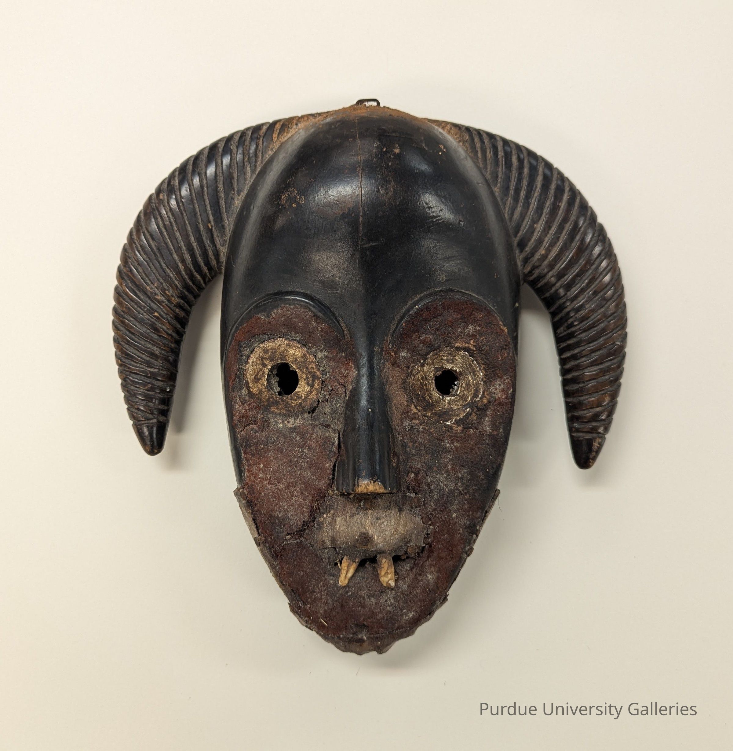 A very expressive mask with a rounded forehead and down-turning, striated horns on either side. Metal is used around the eyes and for the teeth with fur applied for the beard. The red cloth attached to the face suggests danger.