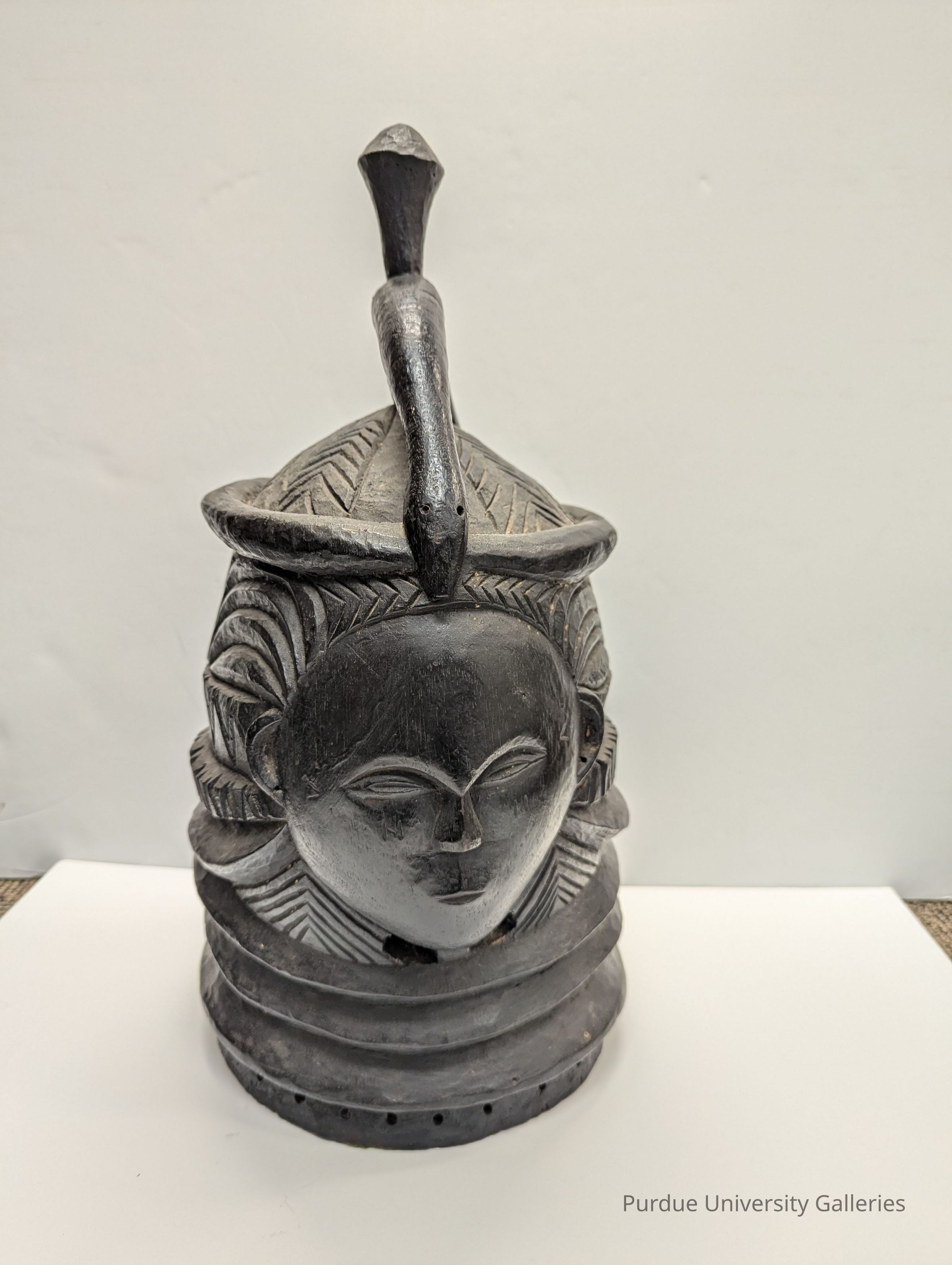 "Mende people of Sierra Leone. It is not clear what the highly stylized disk-shaped form that surmounts the hair crest represents. It is reminiscent of parasols found on other masks. The coiffure is especially elaborate and the black raffia very thick."