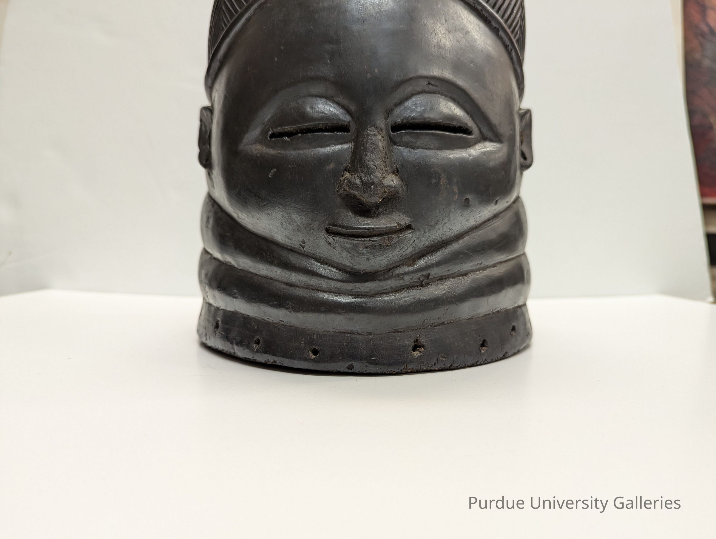 It is not clear what the highly stylized disk-shaped form that surmounts the hair crest represents. It is reminiscent of parasols found on other masks. The coiffure is especially elaborate and the black raffia very thick."