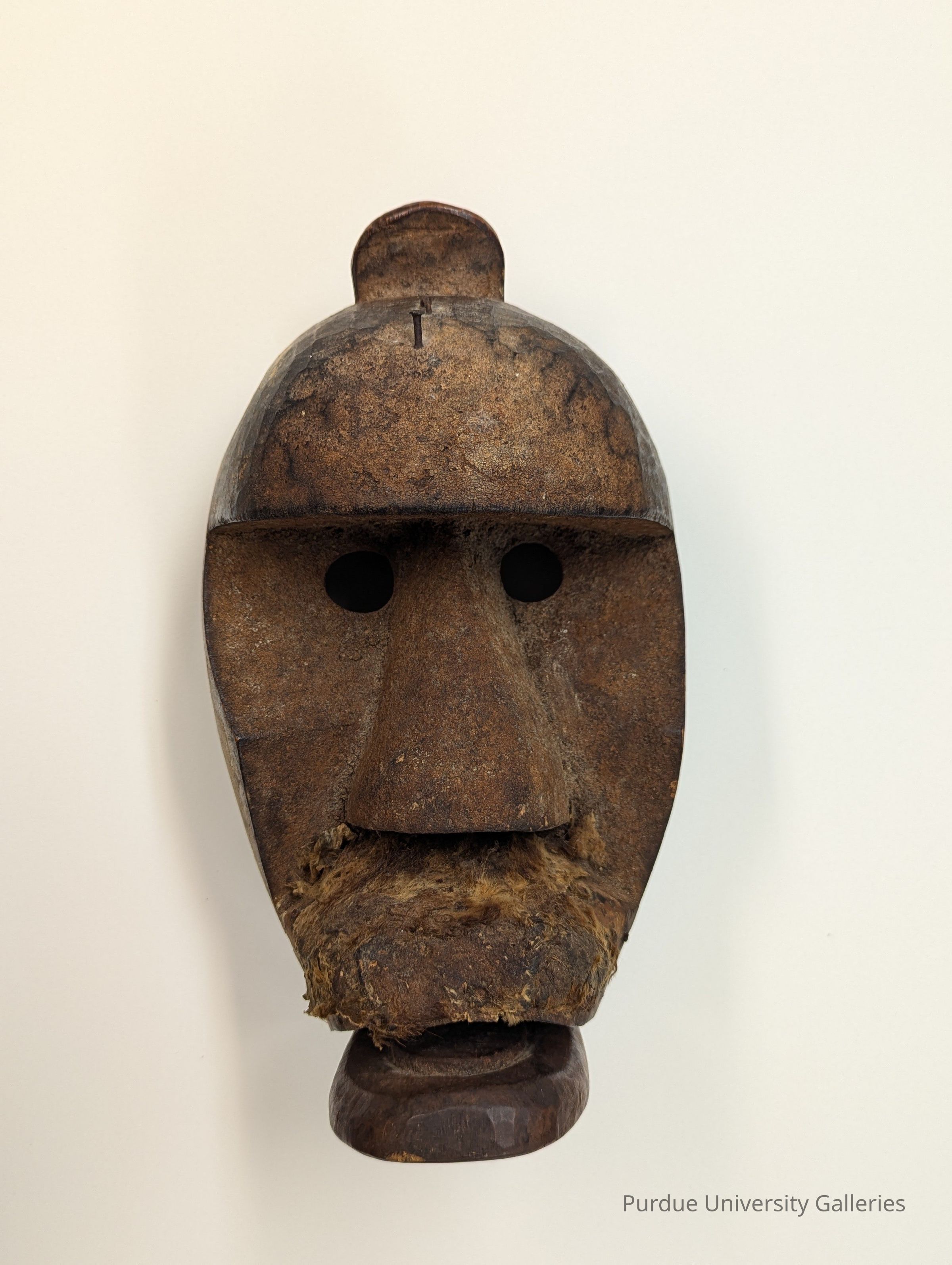 The overhanging brow and money fur on the upper lip indicate the simian nature of this mask. The lower jaw articulates to allow the wearer to act out vocalizations during performances.