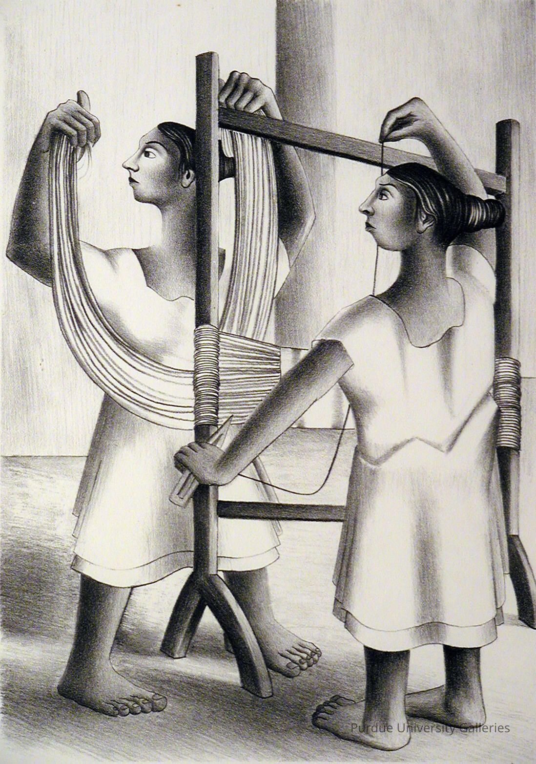 Mayan Women Weaving Francisco Dos.amantes (1911-1986) lithograph, 1946 Francisco Dosamantes studied at Escuela Nacional de Artes Plásticas. Early in his career, he worked for the Secretaría de Educación Pública (Public Education Secretary) before moving into teaching art full-time. Along with many other members of the muralist movement, Dosamantes was a member of LEAR (Liga de Escritores y Artistas Revolucionarios), and a founding member of TGP [Taller de Gráfica Popular) His work; included engravings, paintings, murals, and book illustrations Dosamantes's thematic content often focused on indigenous and agricultural communities that he witnessed during his work for the Secretarla de Educación Pública, which in turn highlighted their exploitation and was distinctly anti-fascist. This work is part of his most famous series of lithographs, which feature scenes from the daily life of the Mayan community in Campeche, Mexico.