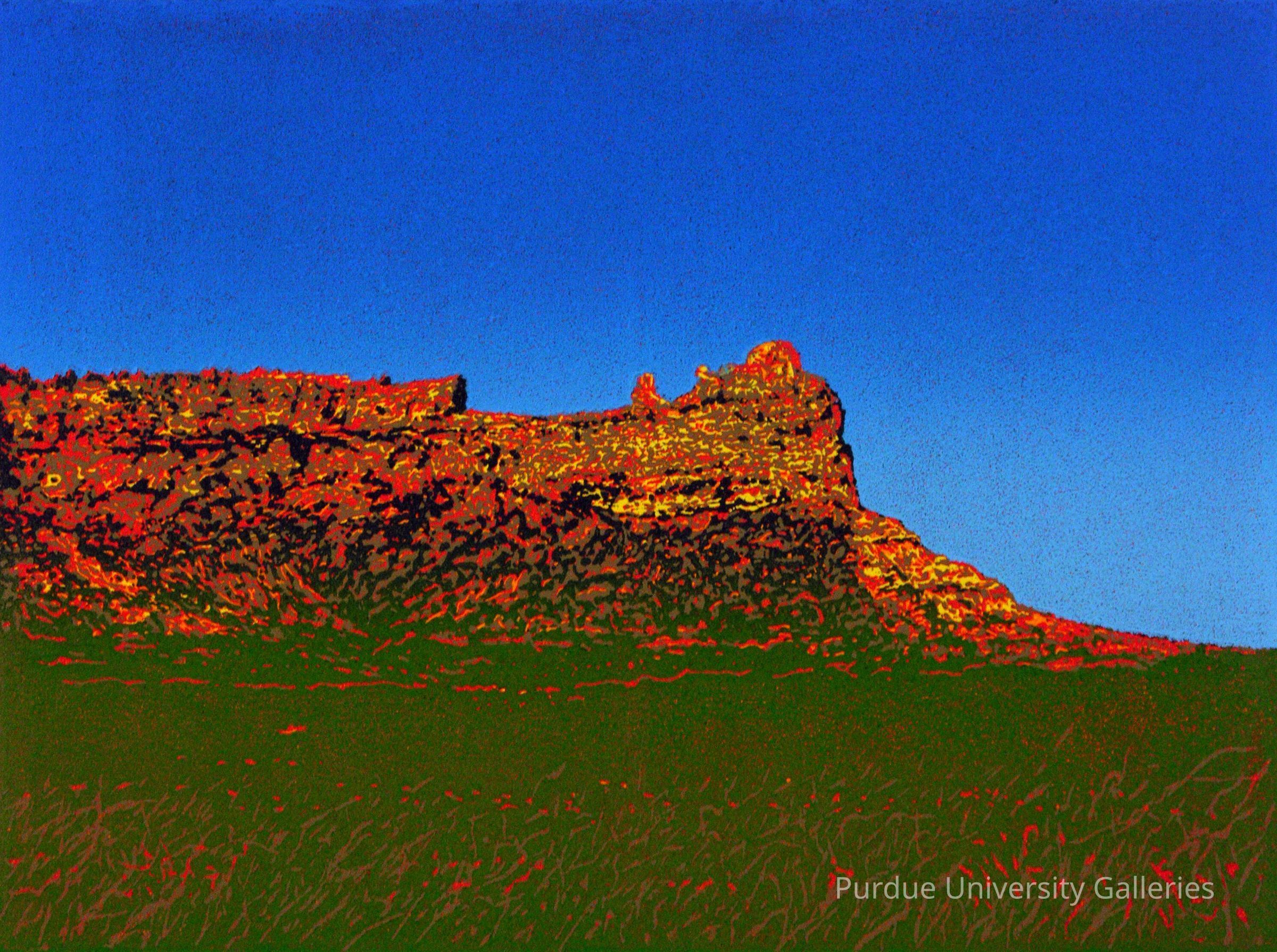 The print is horizontally designed, with more emphasis on the left side. Visible in this print is a long mountain ridge with a jagged top that slopes down on the right. The composition is balanced, becoming lighter in hue on the right. Anderson has utilized a plethora of colors, including shades of green for the grass in the foreground, oranges and yellows for the mountain range, and blues for the background skyline. Overall, there is a delicate balance between realism and fantasy. Mountains from which the scene is taken in Monument Valley, Utah, do have an orange appearance in the brihght sun. Mark Anderson has enhanced and heightened the chromatic scale, creating an almost electric effect.