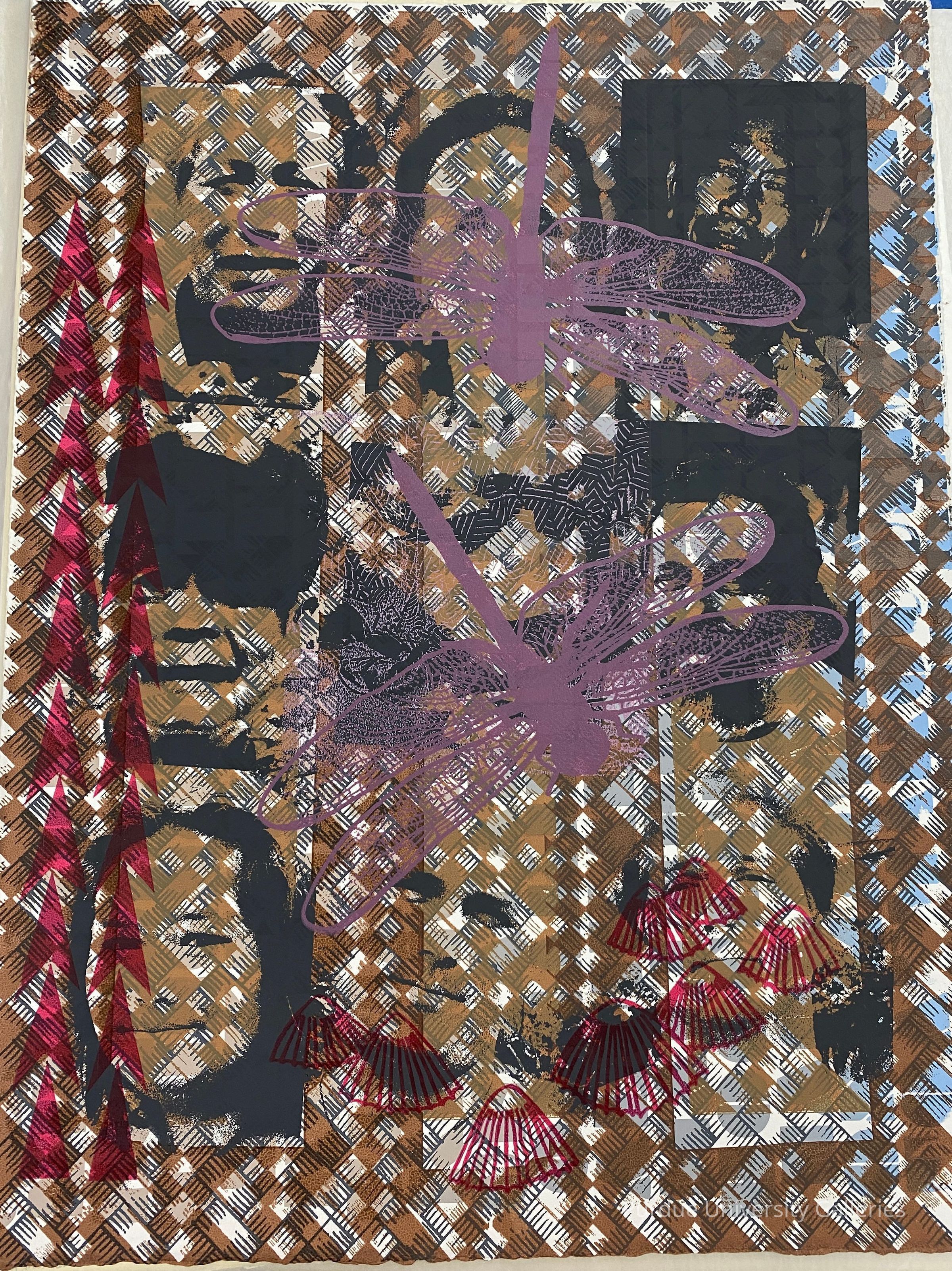 Six faces with two pink dragonflies and eight seashells at the bottom. A geometric, repeating, diamond pattern in the background.