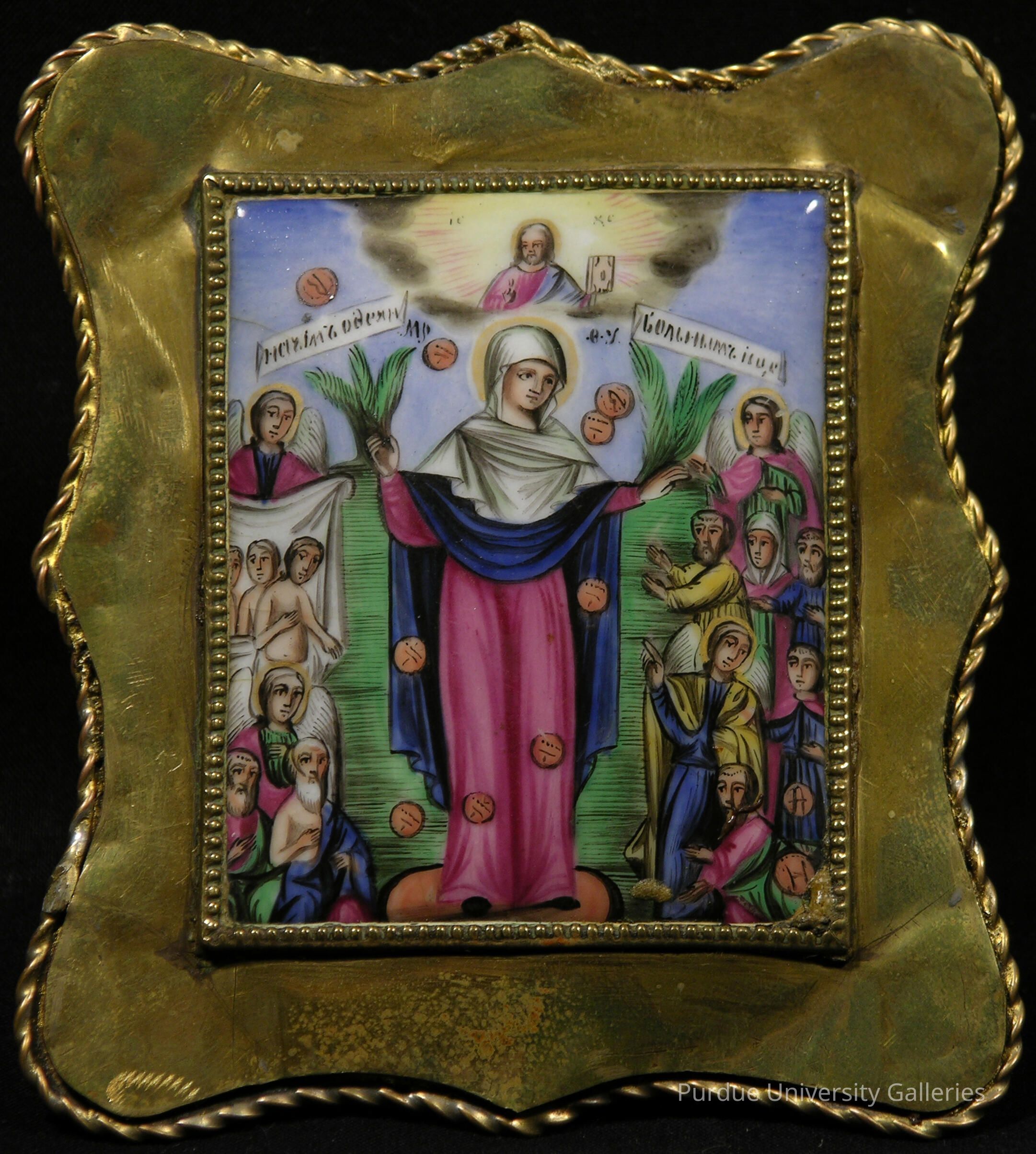 Painted enamel (finift) depicting the Mother of God in white maphorion, blue cloak, and pink robes. Flanking this central depiction are various male and female worshippers and white winged angels on a background of green grass with twin palm like bushes. Above the bushes sit two Cyrillic captions on a white banner. In the top center, God presides over the scene in grey-gold clouds wearing a pink robe, blue sash, and holding the gospel in one hand. Throughout this image are scattered copper colored coins. This is a nod to the original prototype of this image which had coins fuse to an icon when it was struck by lightning and the church alms box fell upon it. The enamel painting is covered in copper with metal frame and standType of Painting