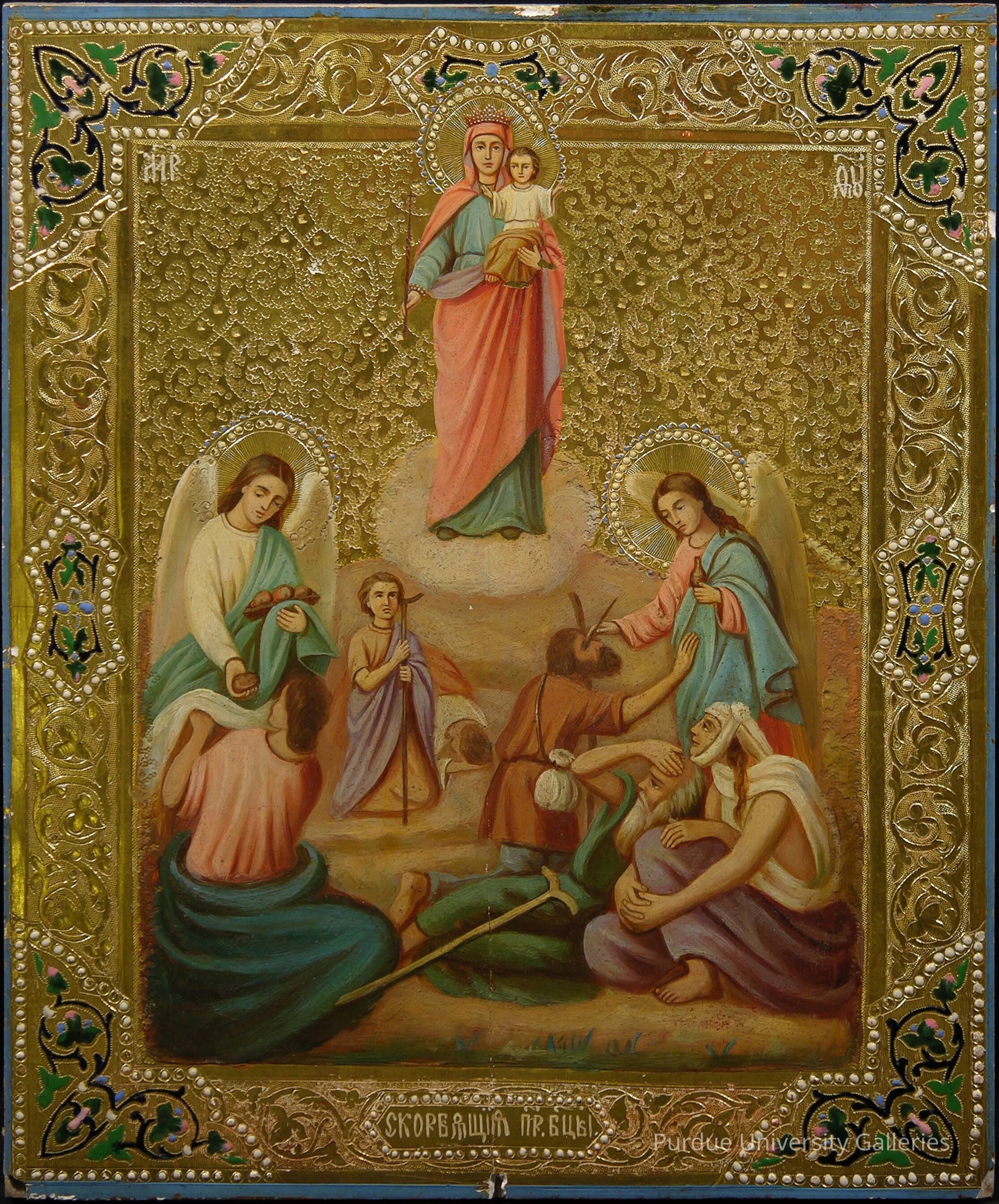 For a description of this subject, see 2005.02.101. In contrast to that more traditional example, this image is reduced to only a few figures representing a crowd of suffering people. Scrolls bearing inscriptions are eliminated. The Virgin and Child are separated from the others by a cloud, but here the figures are arranged in a more three-dimensional space below. There is an abundant use of gold, following Byzantine tradition, and the other colors in this modern example are light, including pastel pink, violet and light green. The border is a pattern of leaves and vines, picked out in color at the corners and in the center in an imitation of enamel decoration.