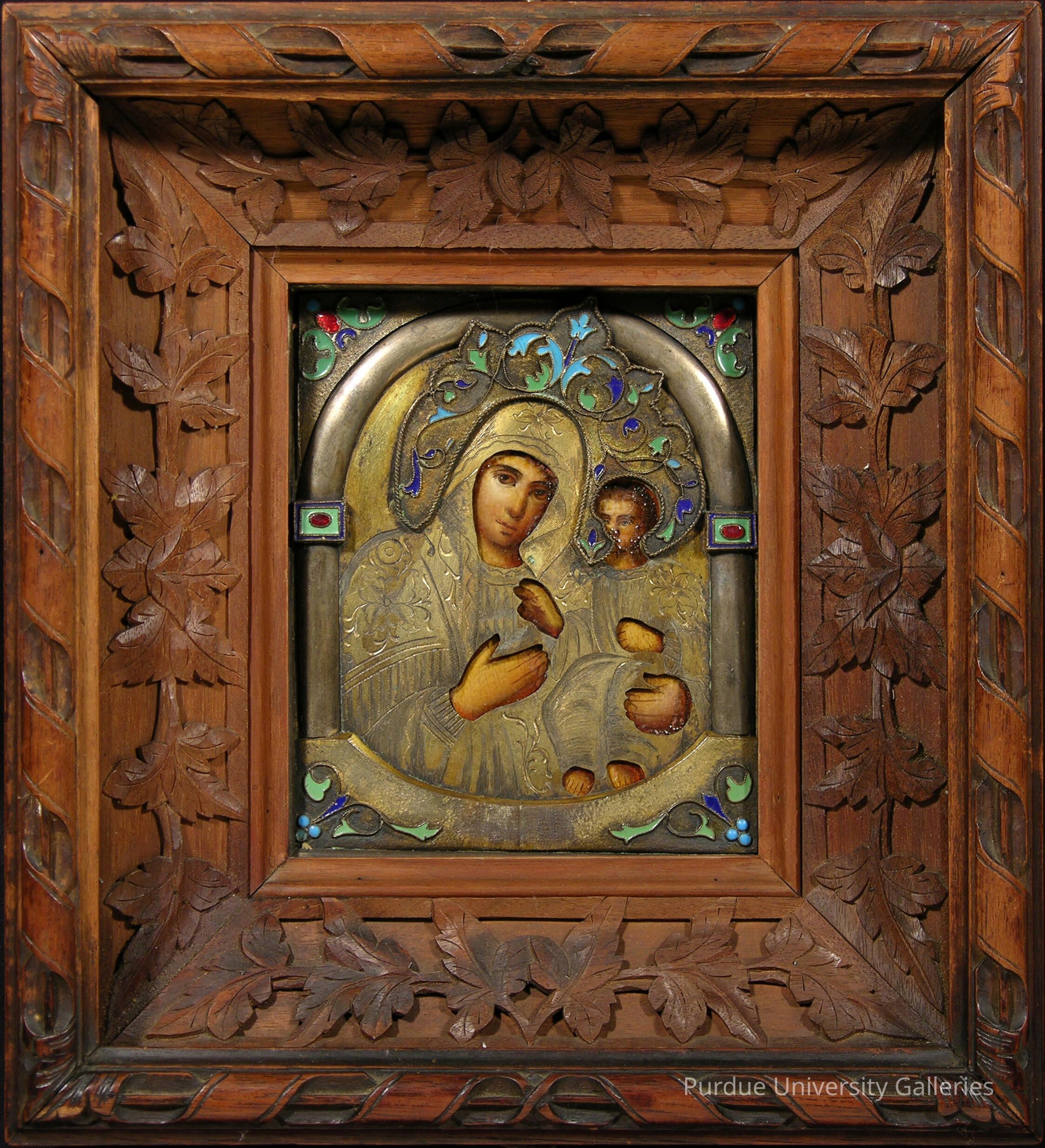 Painting on wood, covered by silver riza with enameling, and outer carved wood box (kiot). The kiot is engraved with tri point ivy leaves under the lid. The riza features blue, green, and red detailing in the four corners and in floral motifs over Mother and Child's heads. Their faces and hands are painted, and Mary holds Jesus on her left. Both of their riza robes are engraved with floral motifs. Icon is backed in deep turquoise velvet and there are no standard marks or makers marks in the riza. Icon is packed into the kiot with Russian newspapers in Cyrillic text dating to 24 December 1992.Type of Painting