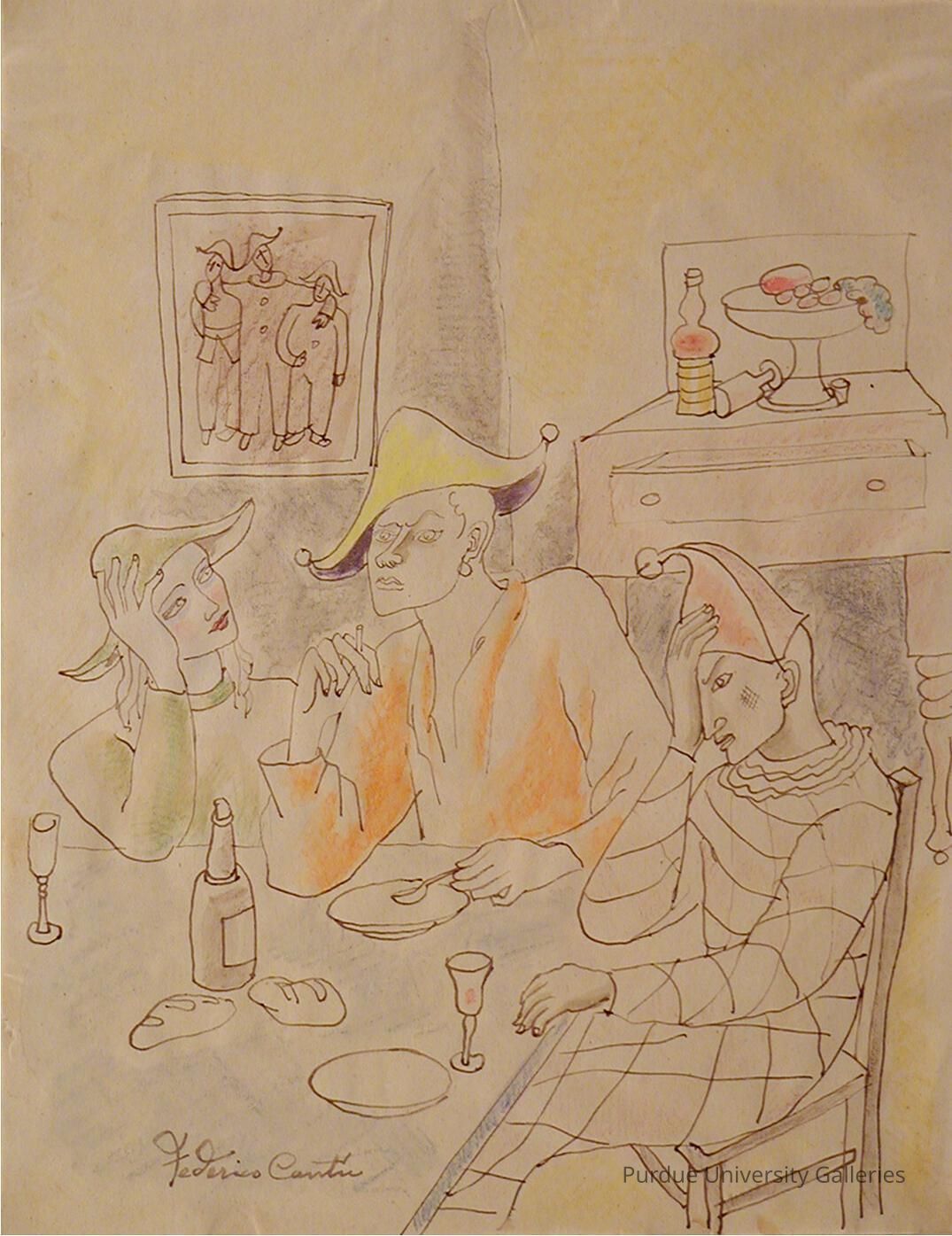 "Federico Cantu (1908-1989) Born in Cadereyta de Jimenez, State of Nuevo Leon, Cantu began his study of art at the age of fourteen in the Escuela de Pintura al Airo Libre of Coyoacan. At sixteen he was sent to Paris to study art in the studio of De Creft. Later he went on to study in Spain, returning to Mexico in 1932. He was befriended by Diego Rivera, who was painting murals in the Department of Public Education Building. Cantu has painted several frescoes: in the cathedral at San Miguel de Allende, in the chapel of the Seminario de Misiones de Santa Ursula Xitla at Tlálpan, and in the convent of San Diego in Mexico City. One of Mexico’s most distinguished painters, he is also unsurpassed as a printmaker. He has also carved a monumental work in high relief in the mountain face west of Linares and south of Monterrey. From 1943 until his death he was a teacher in the School of Painting and Sculpture at the National Institute of Fine Arts. He was honored with a major retrospective exhibition in Mexico City at the lnstituto Nacional de Bellas Artes in 1989.