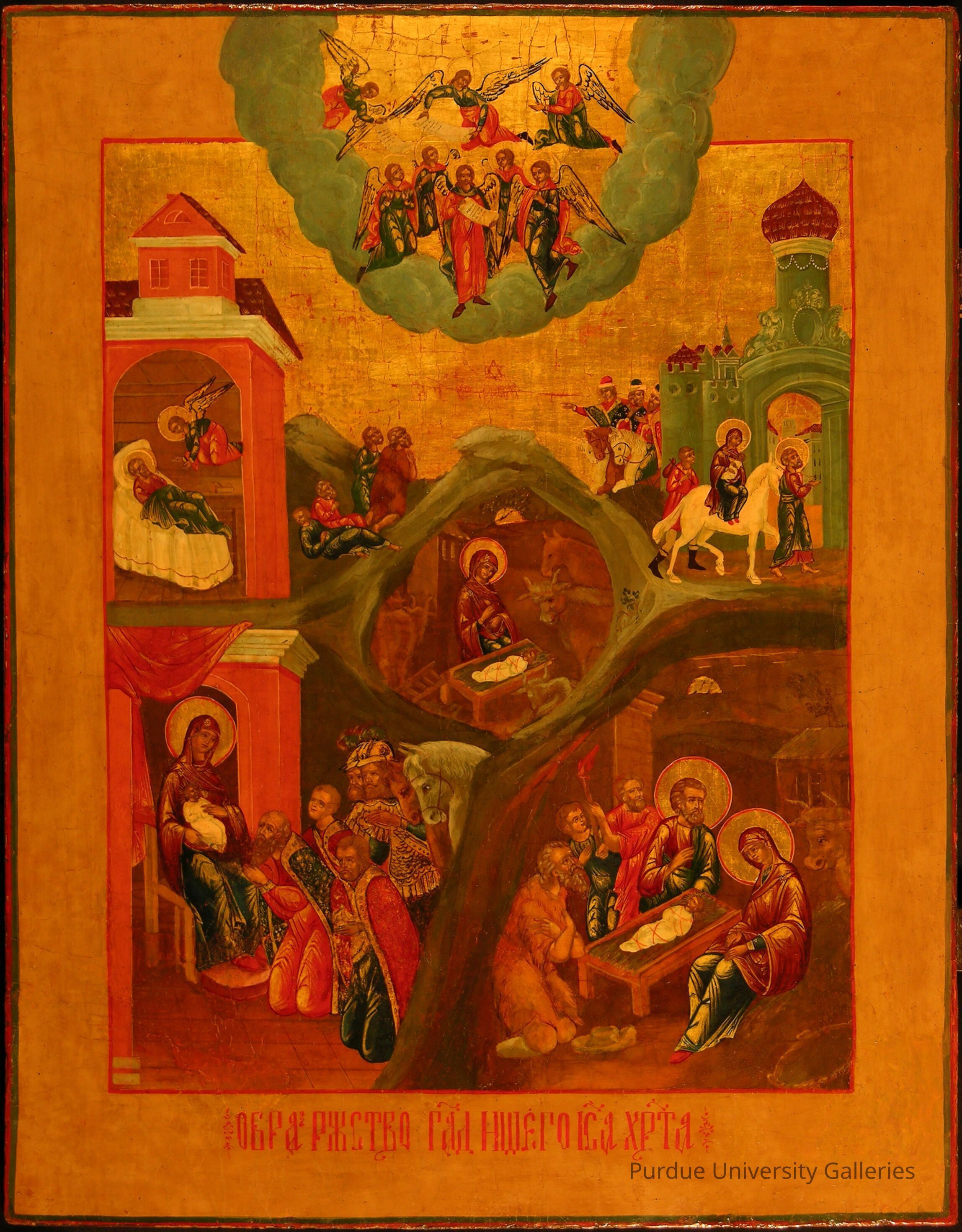 Tempera on curved wooden panel with gold leaf halos and background bordered in red, teal, and mustard yellow. A red Cyrillic caption sits at the bottom in the middle. At the top, a blue ring of clouds encases eight angels. Below, a red building on the left and a blue building on the right showcase five different scenes from the nativity story. In the center, Mary is shown in a cave with the Christ child wrapped in white tied with red string with a bull and a horse. Mary and Christ child are greeted by the wise men and shepherds on the bottom left and right respectively. In the upper right she rides a white horse led by Joseph.Type of Painting