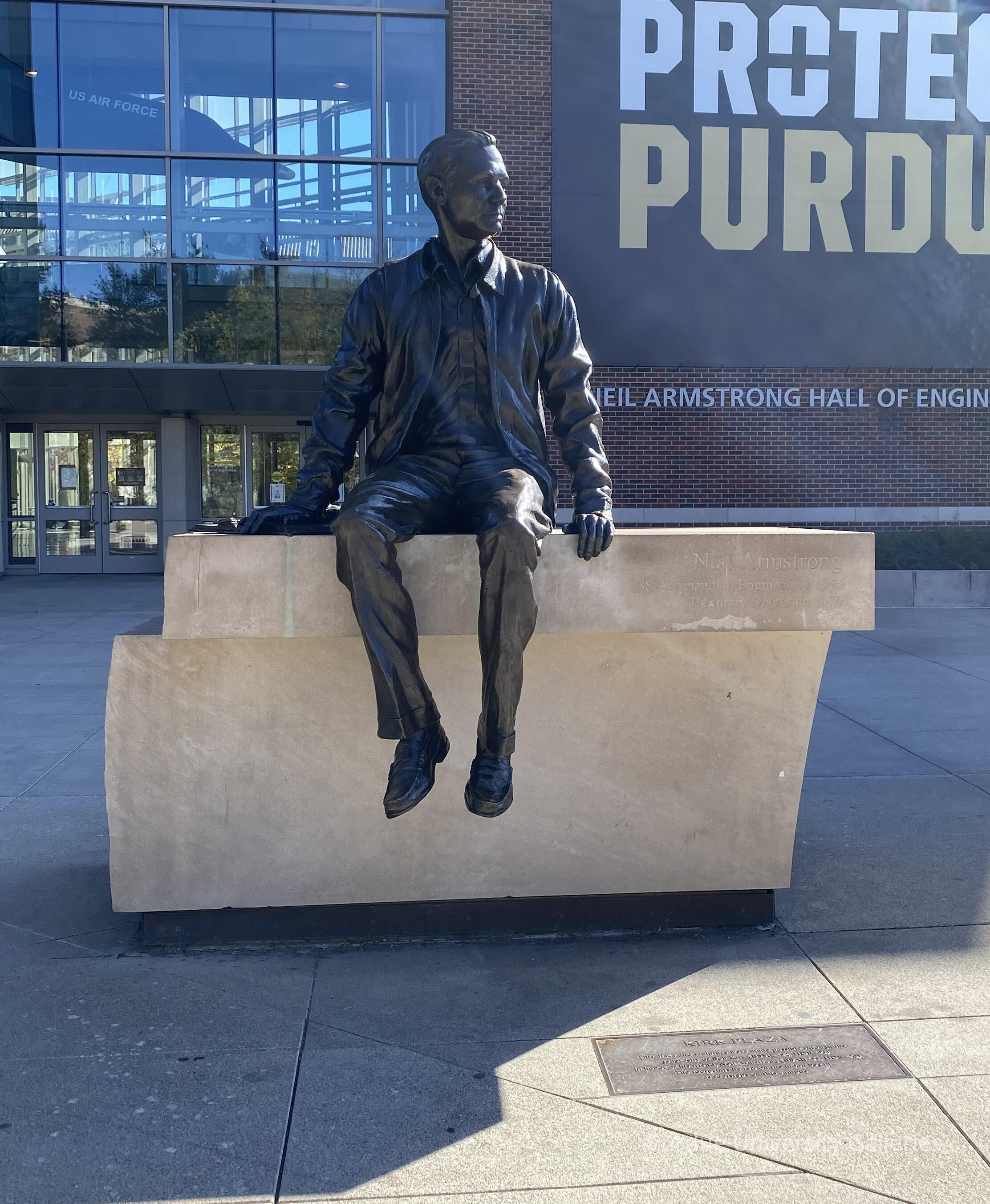 Sculpture of Neil Armstrong sitting on concrete block with 2 sides textured like rock. Armstrong is looking west, with his right hand on 2 books, one open and one closed. the closed book's cover has Purdue Pete logo and "Boilermakers" written on itLexicon