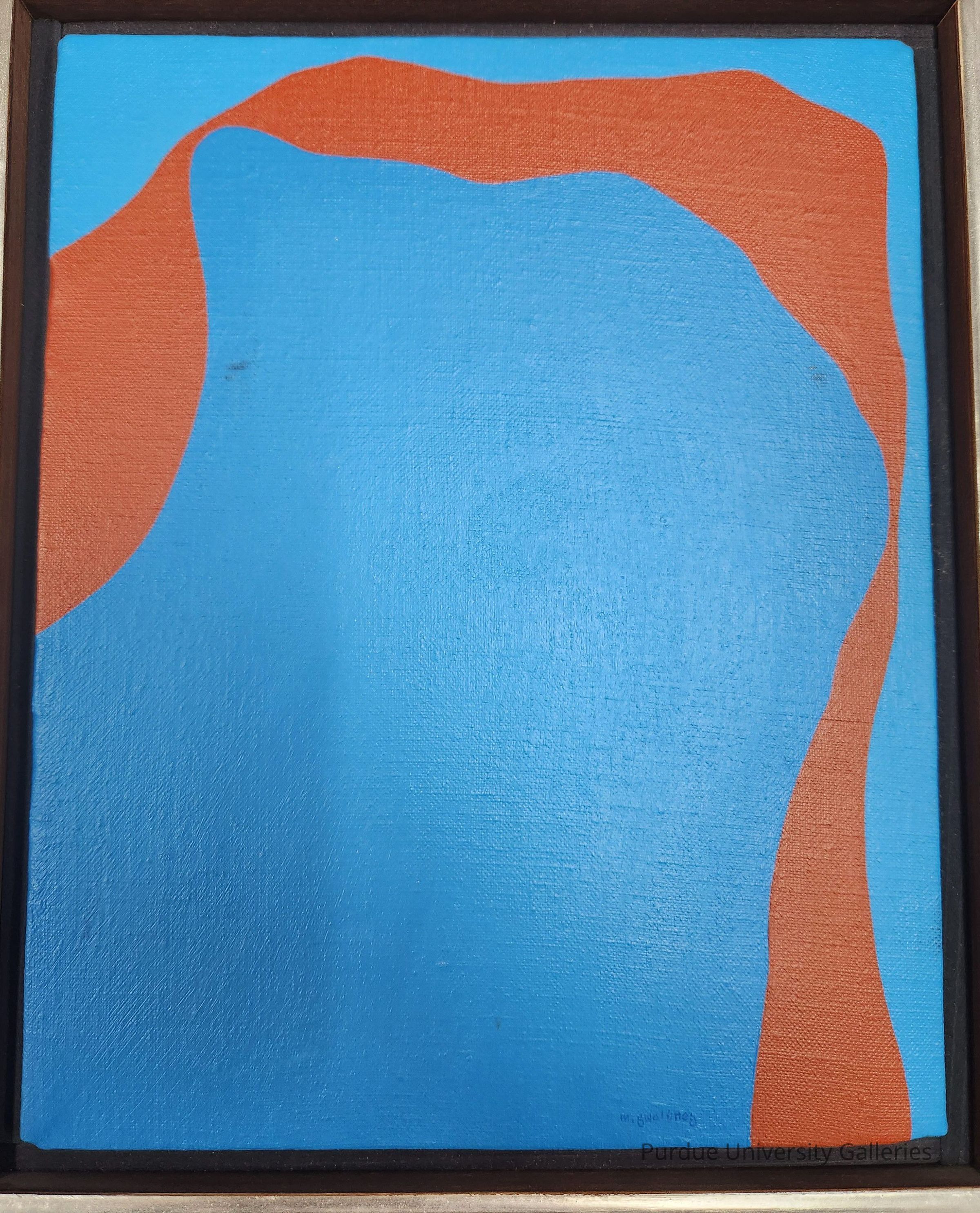 A curvy red line runs through blue, swirling around and moving from left to the bottom right hand of the canvas. The red line which divides the blue central image is think and runs horizontally, the line which zigzags and curves down the page guides the viewer to follow the line, as well as draws attention to the middle blue shape. By using the line to divide the image, it creates an empty space which balances the movement of the line and breaks up the monochromatic background.Inscription/Signature/Marks