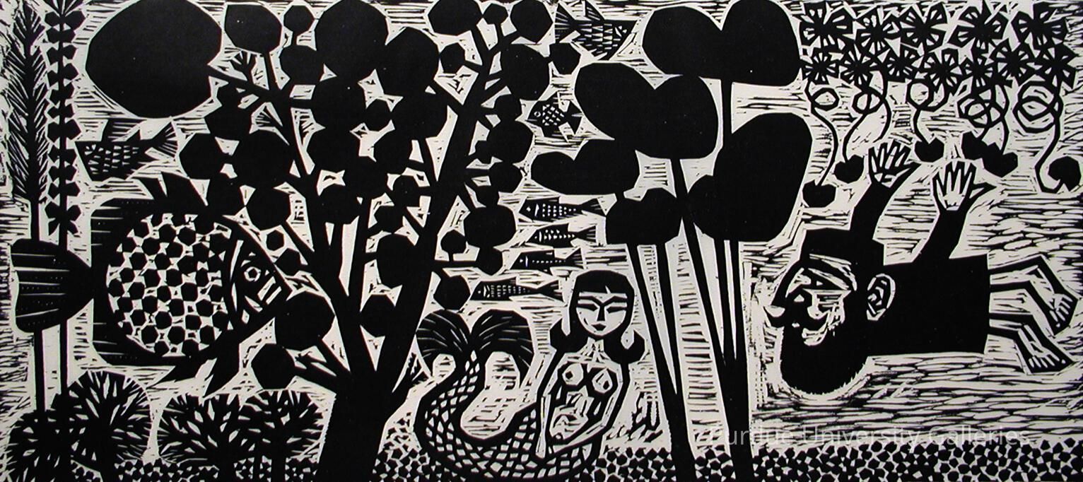 This one-color block print depicts an underwater scene with a mermaid, a man and other aquatic life surrounding it. It's a woodcut. The figures themselves are more stylized than realistic with bold lines and blocky facial features. This woodcut uses positive and negative space to create texture, dimension and chatter to its advantage.