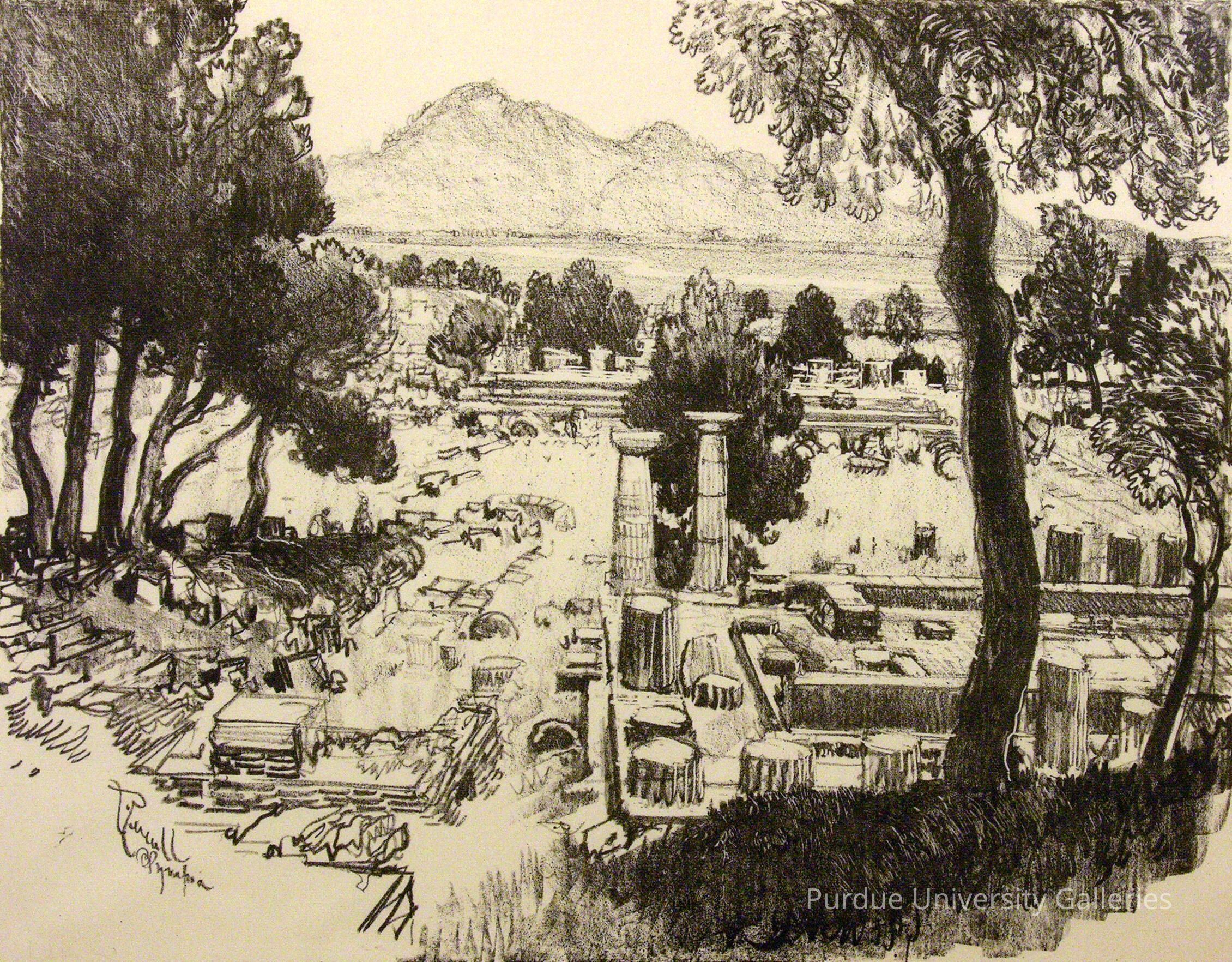 Olympia from the Hill to the River is in the lithographic technique in which Pennell excelled. In the foreground of the image appear the ruins of the Temple of Hera at Olympia in Greece. On the left side next to trees are two human figures whose small size emphasizes the scale of the ruins. The temple is largely destroyed, with only two columns of the Doric order standing. Also visible farther back in space is another temple dedicated to the goddess Zeus, husband of Hera. What is unique about this lithograph, aside from its unusual perspective on the ruins, is the variety of textures created. The mountains and rivers show the texture of the rock on which the lithograph was produced. The grasses in the foreground have small scratches, which Pennell probably made with the assistance of a small blade. By contrast, the trees and architectural ruins have stronger, bolder lines. The ruins are framed by the trees, mountains, and a river. The contrast between organic and man-made features focuses attention on the Temple of Hera, highlighted by the two re-erected columns. Pennell also leaves the watermarks from his paper in the image. In the bottom left corner, the viewer can read the word “INGRES,” a brand of paper from this time period. Pennell produced hundreds of lithographs during his career. Many of his lithographs depict the interaction between people and nature. Pennell’s Olympia from the Hill to the River is similar in style to his Temple of Athena Nike, Athens, also in this collection. Both depict famous ruins in Greece and are shown from an unexpected angle. The use of light and shadow helps bring the main feature to the fore. These lithographs also have the same type of texture, rarely found in lithographs. Pennell first drew the image and then transferred it to the stone instead of drawing directly onto the stone. He also was known to ‘texturize’ the paper before starting the lithographic process, by first sketching the image on the paper, to define certain areas with the appropriate textures.