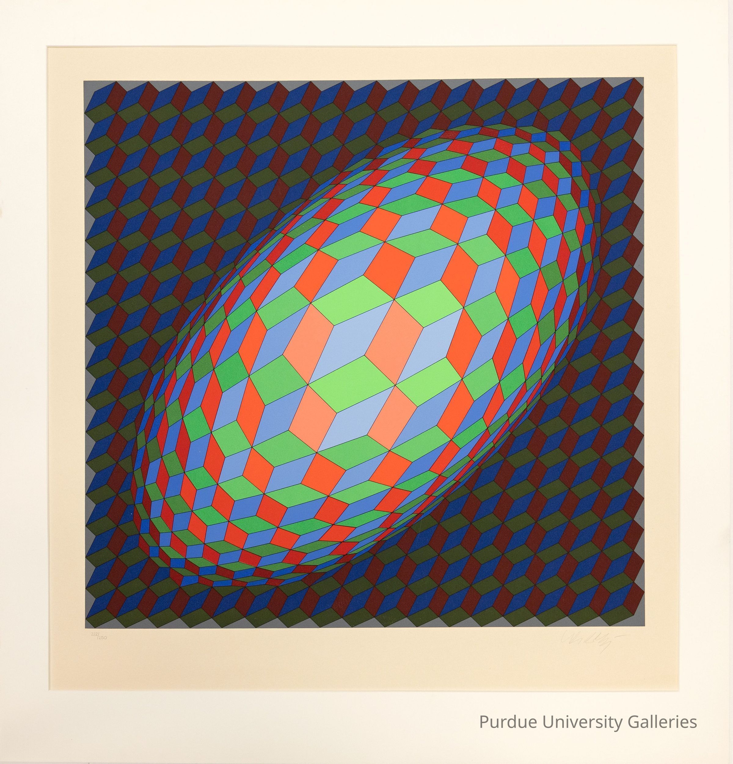 "The most prominent of the design-based optical artists to create a large body of prints is Victor Vasarely, whose Hungarian art teacher was a former Bauhaus student. Vasarely has theorized that the integration and inseparability of form and color, which he calls ""plastic unity,"" provides the basis for the construction of infinite numbers of compositions. In most of his works the grouping of units creates contrasts of form and color that stimulate a visual sense of spatial movement.
