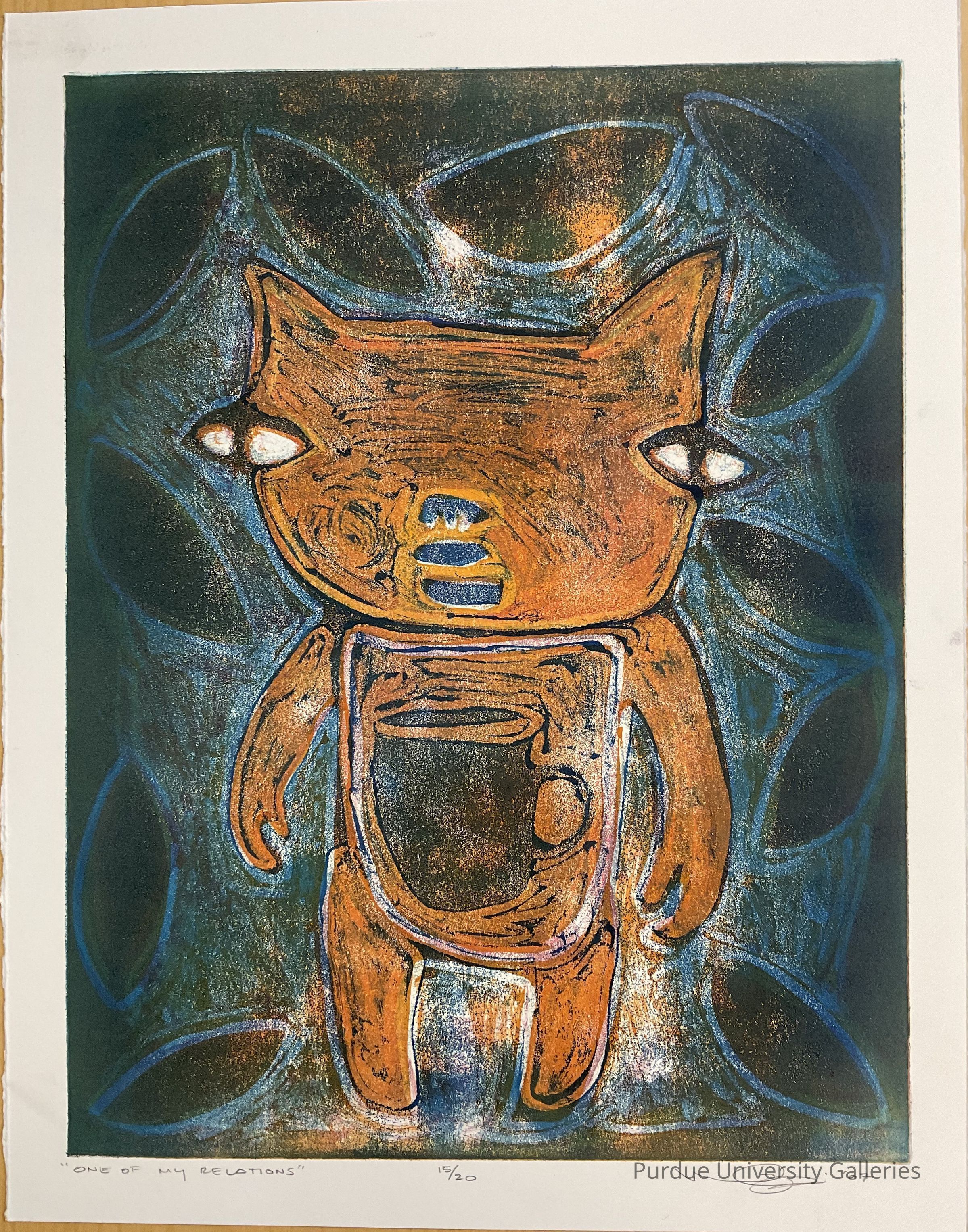 Monoprint on heavy paper of a cat-like creature with eyes set very far apart, orange body and standing like a human. The background has cat eye shapes scattered around the image. Along the bottom edge of the print in pencil "One of My Relations, 15/20, Melanie Yazzie, 07"Type of Print